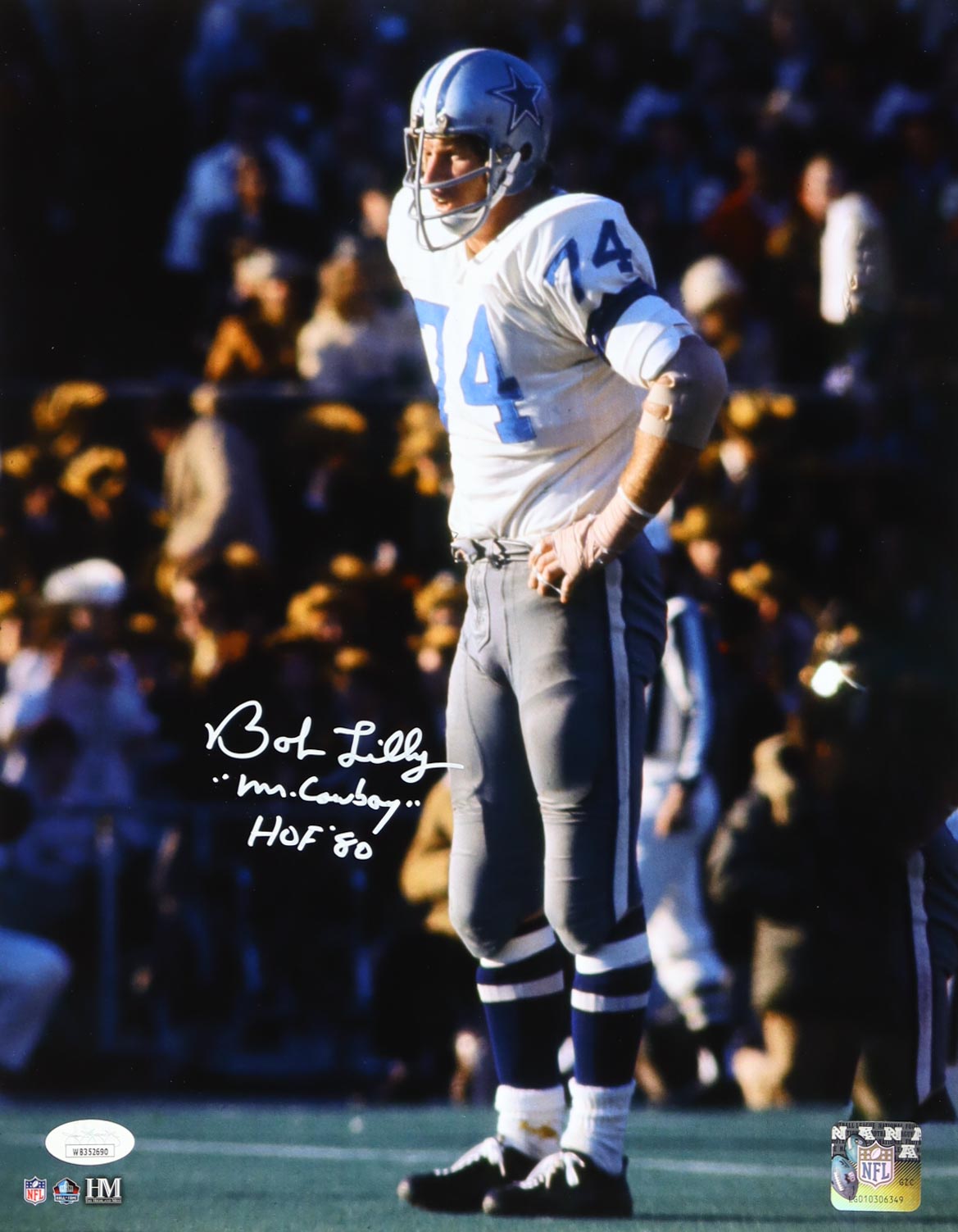 Photo measures 11" x 14" in size. Hand-signed and inscribed by Bob Lilly (HOF, Dallas Cowboys).