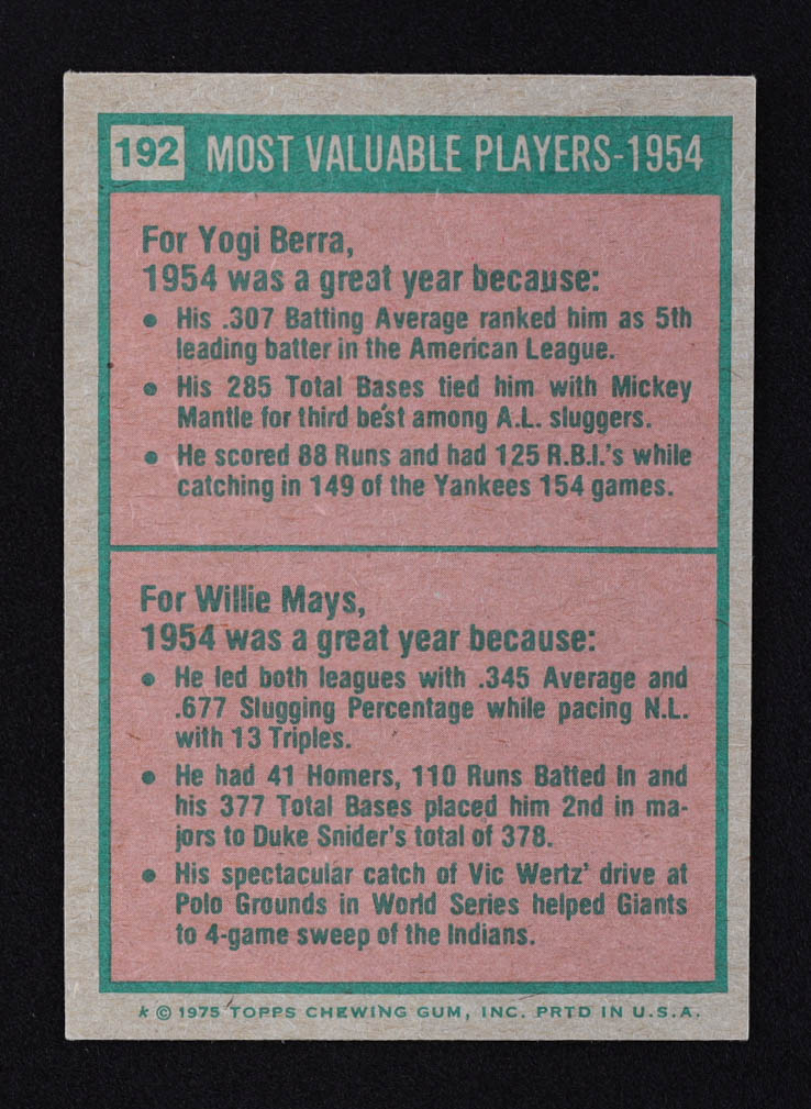 Yogi Berra / Willie Mays 1975 Topps #192 MVP