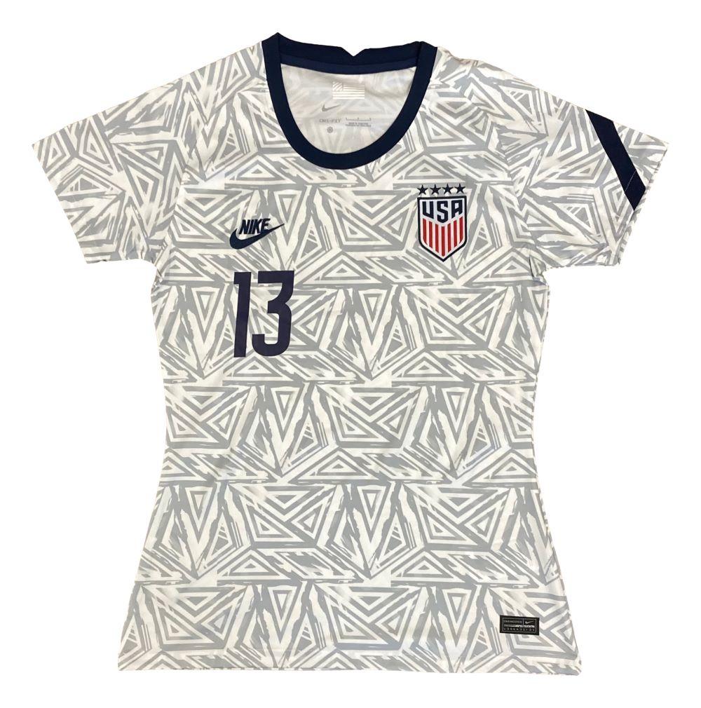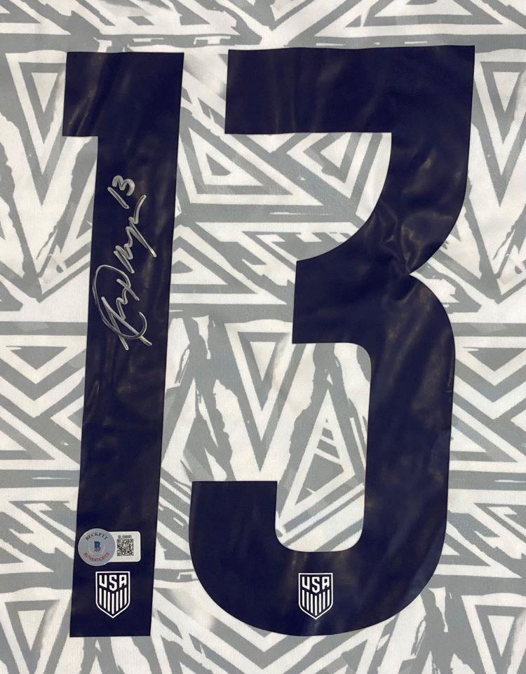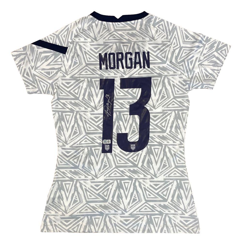 Nike jersey with everything pressed on, size L. Hand-signed by Alex Morgan.