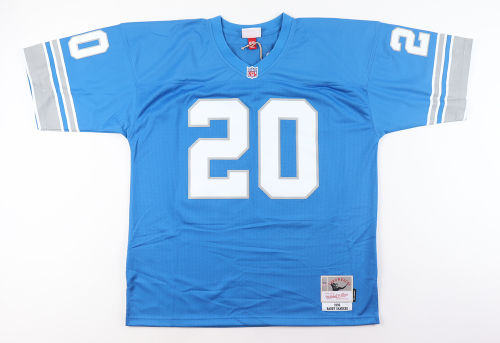 Mitchell & Ness jersey. Everything sewn on, size 48 (XL). Hand-signed by Barry Sanders (Detroit Lions, HOF). Please note, there is residue on the sleeves.