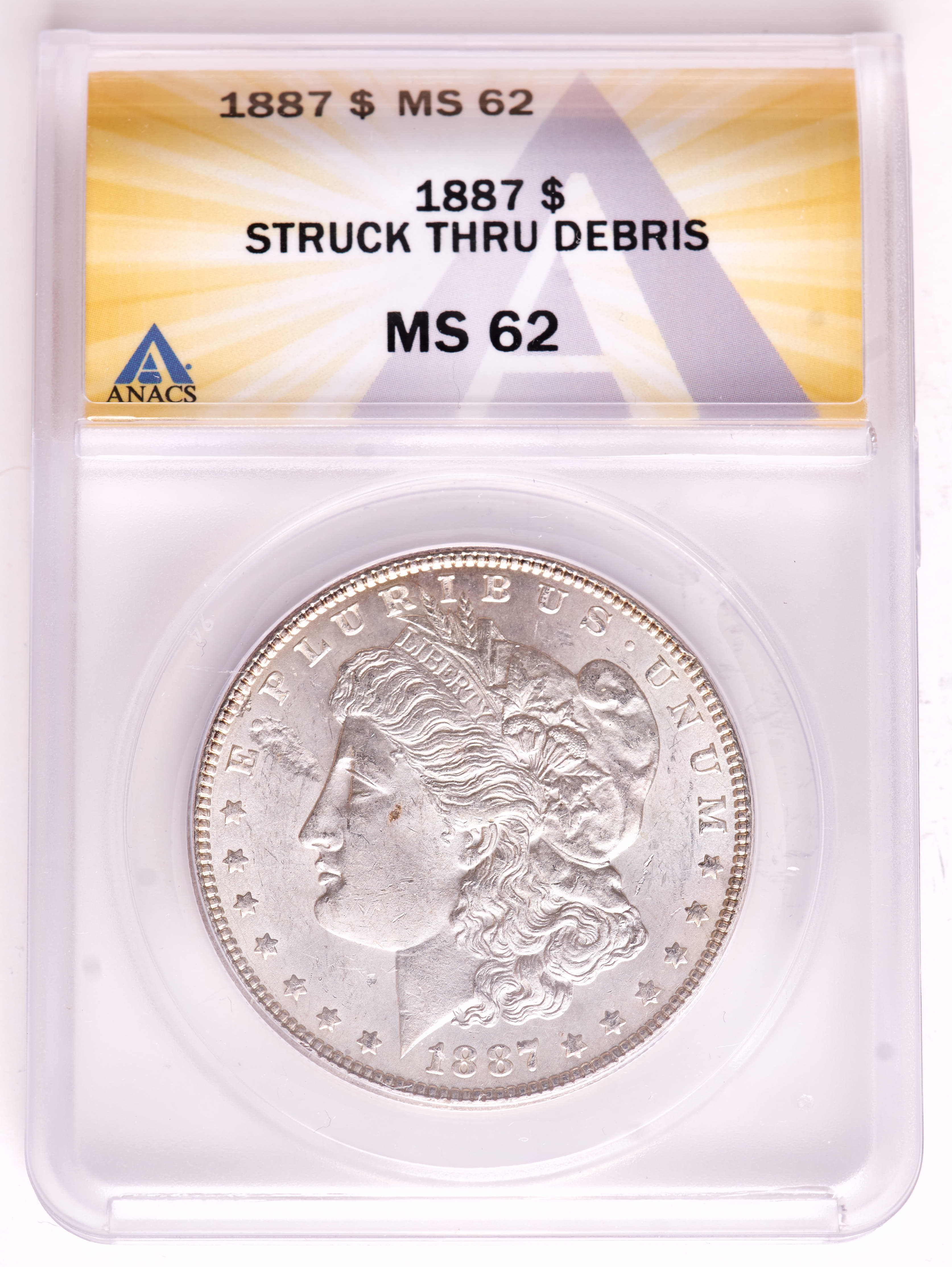 1887 Mint Error - Morgan Silver Dollar, Struck Through Debris (ANACS MS62)