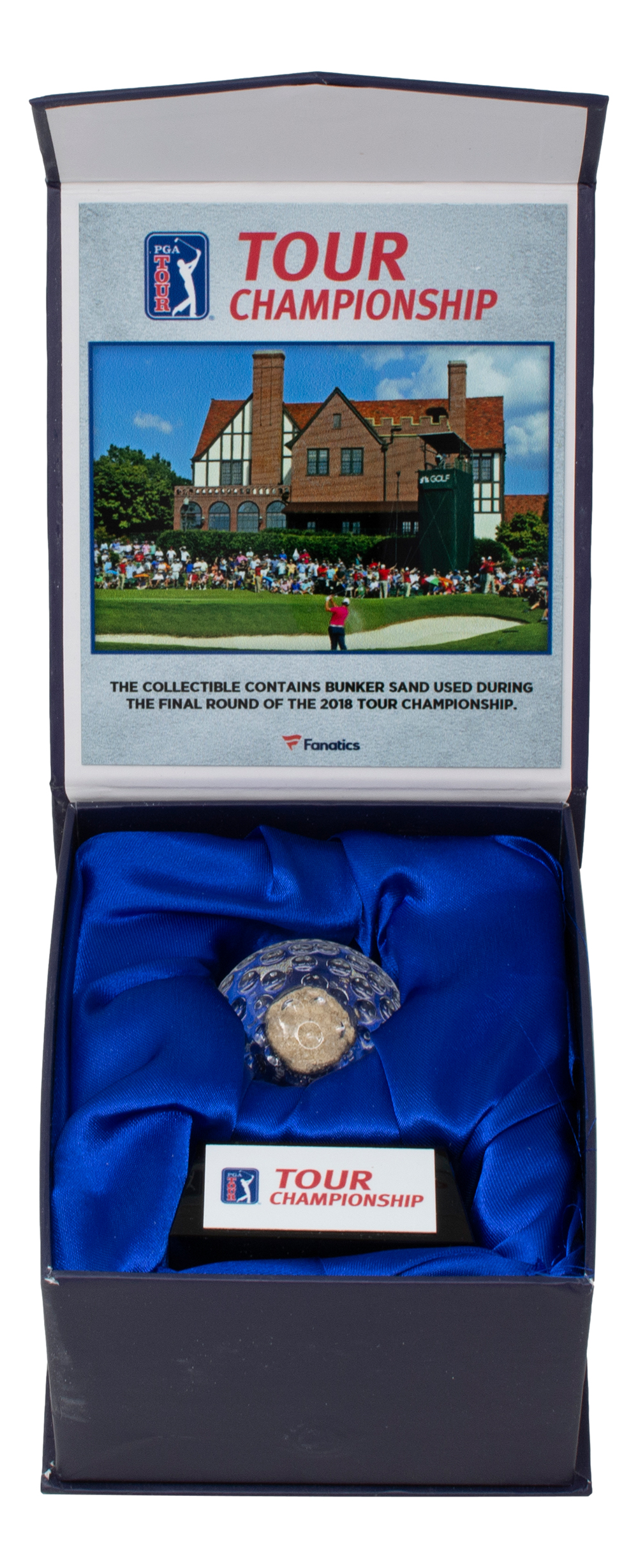 PGA Tour Championship Golf Ball comes filled with tournament-used bunker sand from the 2018 PGA Tour Championship Final Round. Includes Fanatics Box as shown.