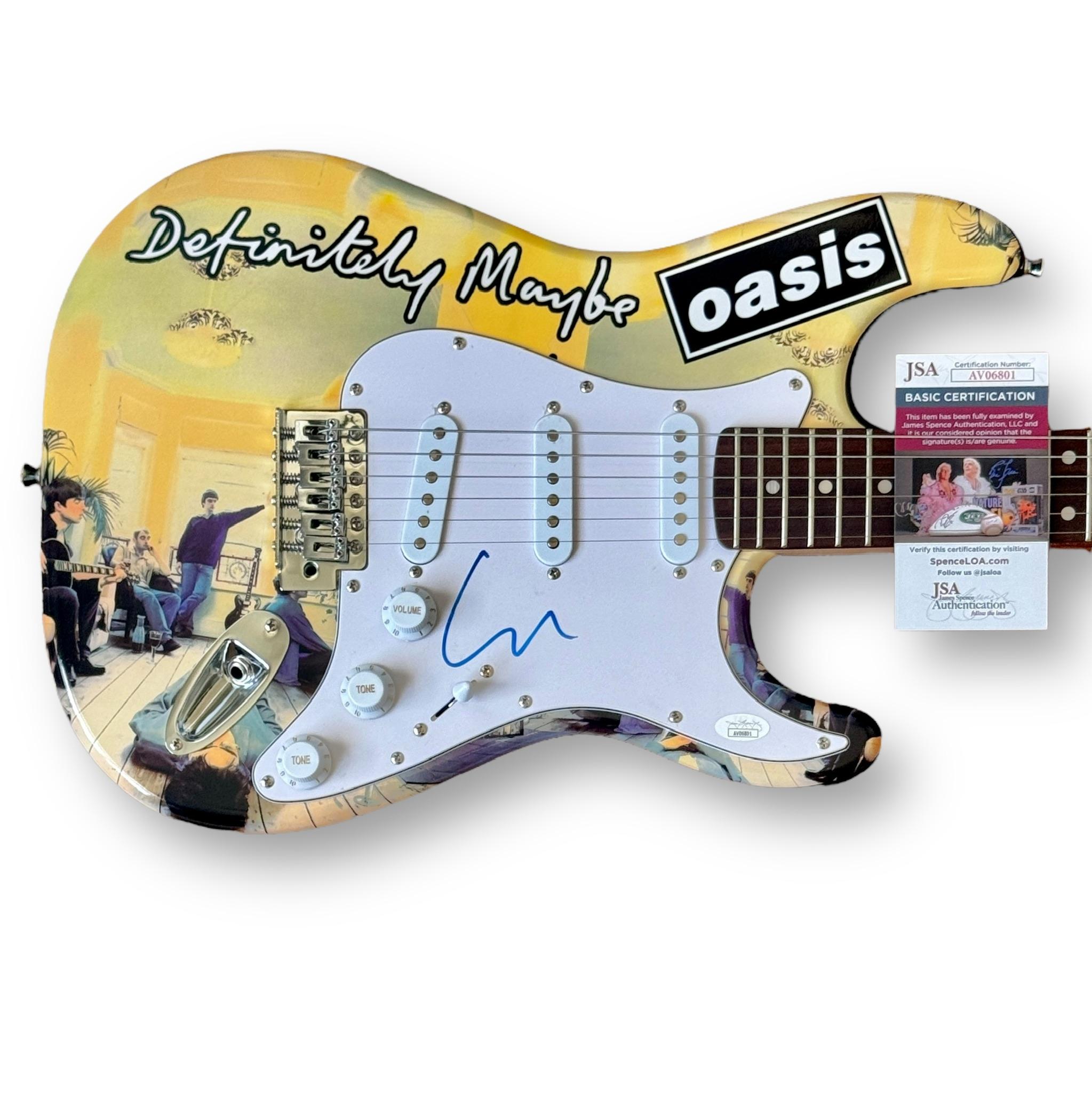 Set of 2: Custom Autograph Edition Stratocaster style electric guitar measures approximately 39" in length and has been hand-signed on the pickguards by Noel Gallagher (lead guitarist) and Liam Gallagher (lead singer).