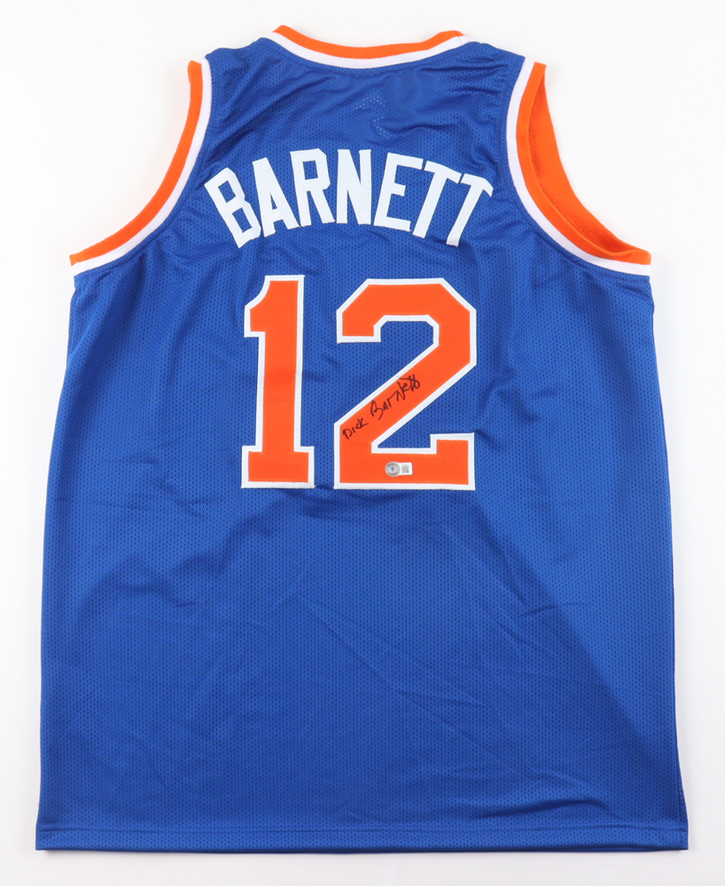 Custom jersey with everything sewn on, size XL. Hand-signed by Dick Barnett.