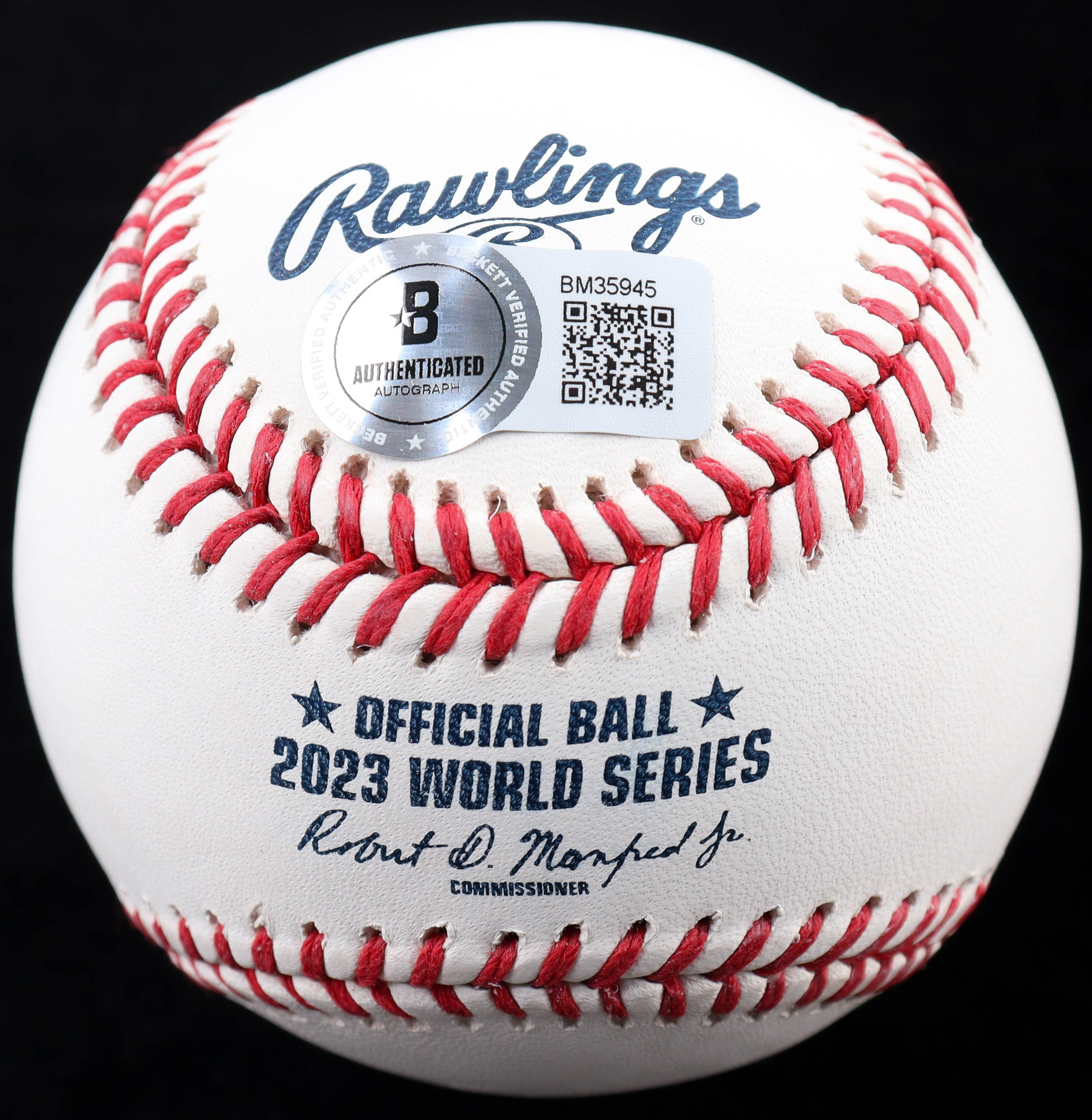 Rawlings Official 2023 World Series baseball. Hand-signed and inscribed by Jon Gray (Texas Rangers).