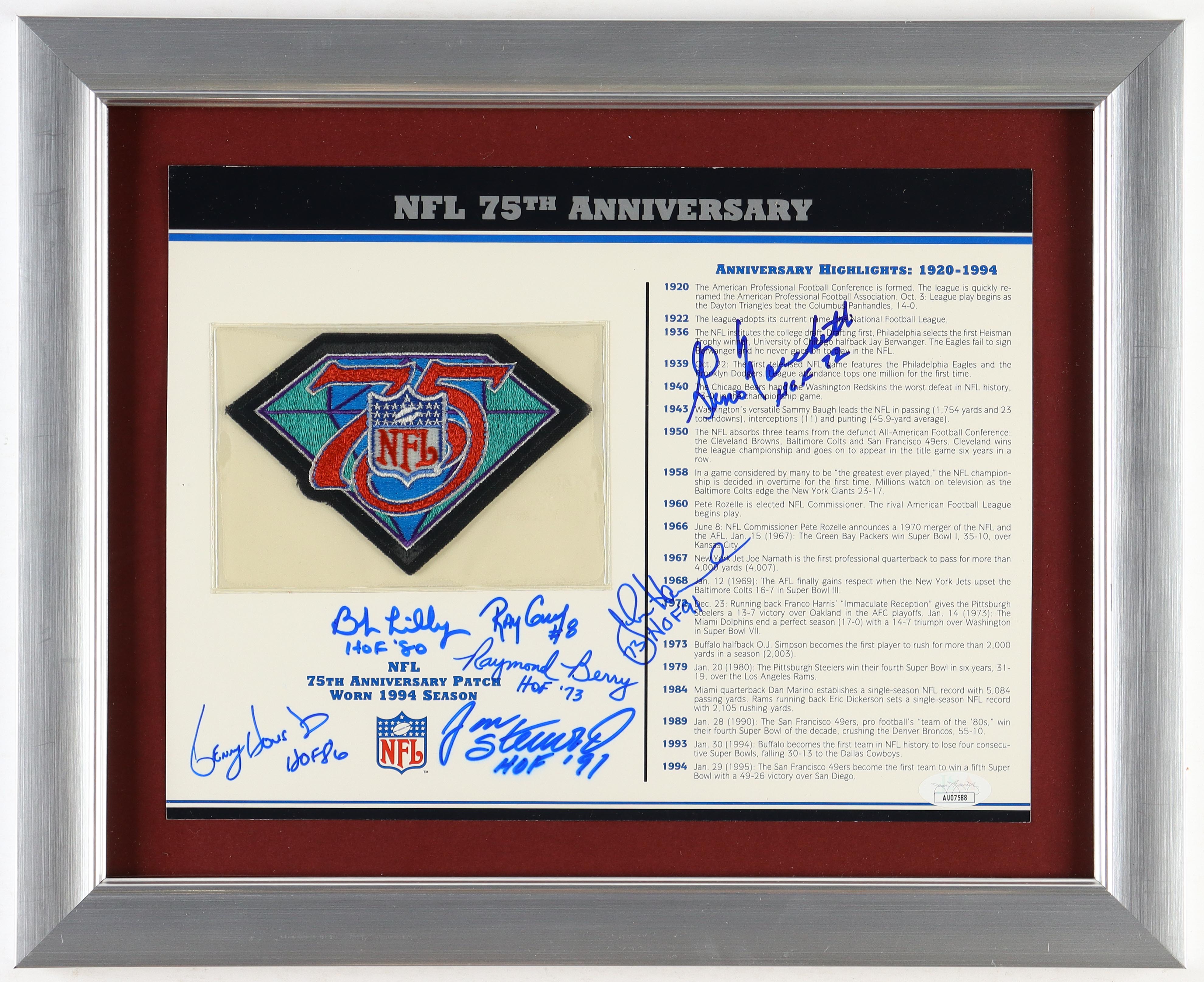 NFL 75th Anniversary Stat Patch Card Custom Framed Display With Multiple Hall Of Fame Inscriptions Signed By (7) With Raymond Berry, Gino Marchetti, Bob Lilly, John Hannah (JSA)