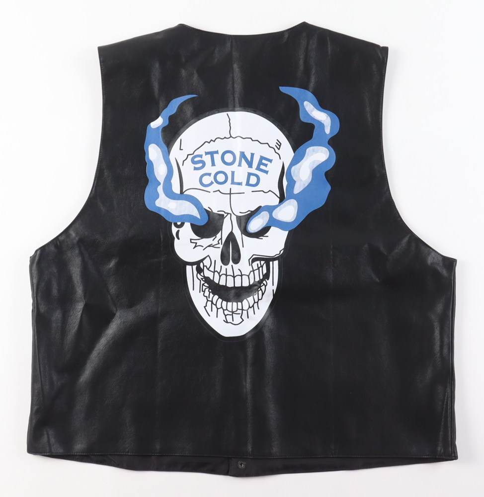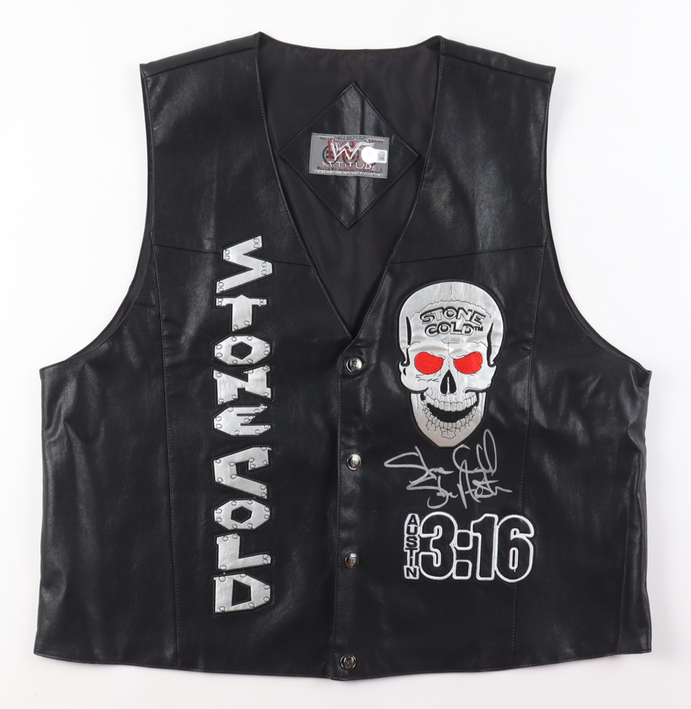 WWF vest. The front logos are sewn on and the back logo is printed on, size XL. Hand-signed by "Stone Cold" Steve Austin (HOF).