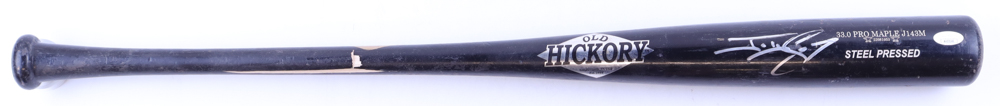 Old Hickory baseball bat. Hand-signed by Jonny Gomes (Tampa Bay Rays). The bat has been game-used by an unknown player and shows associated scuffing and cracks.
