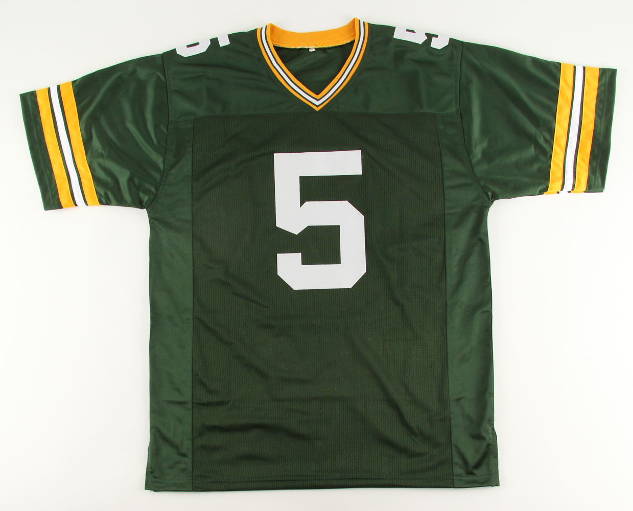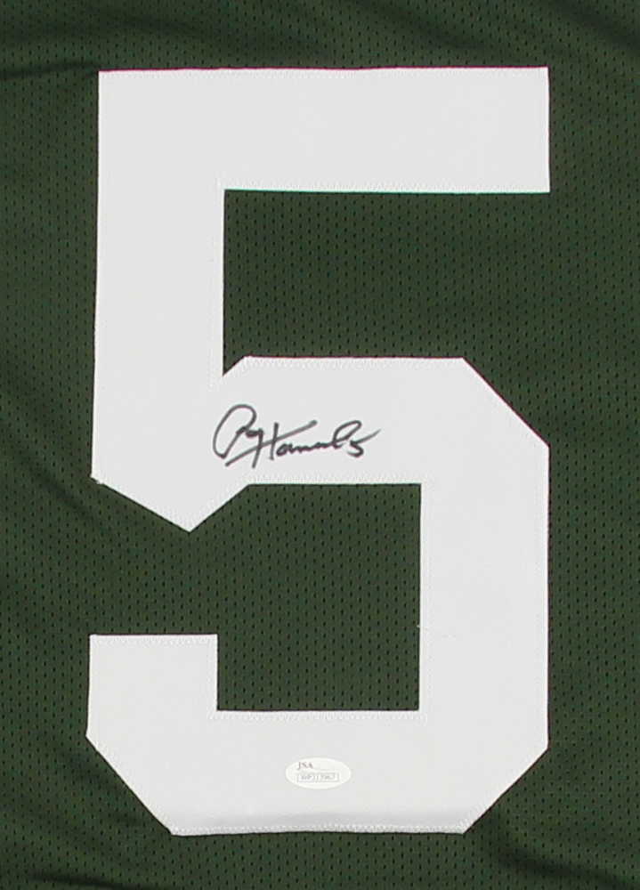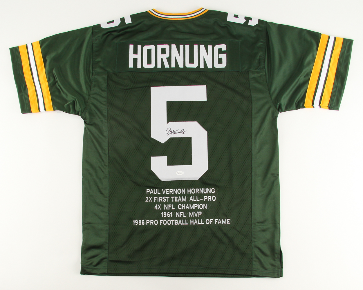 Custom on-field style jersey. Everything is sewn on, size XL. Hand-signed in black felt-tip pen by Paul Hornung (HOF). Hornung's career highlights are custom stitched below the numbers on the back side of the jersey.