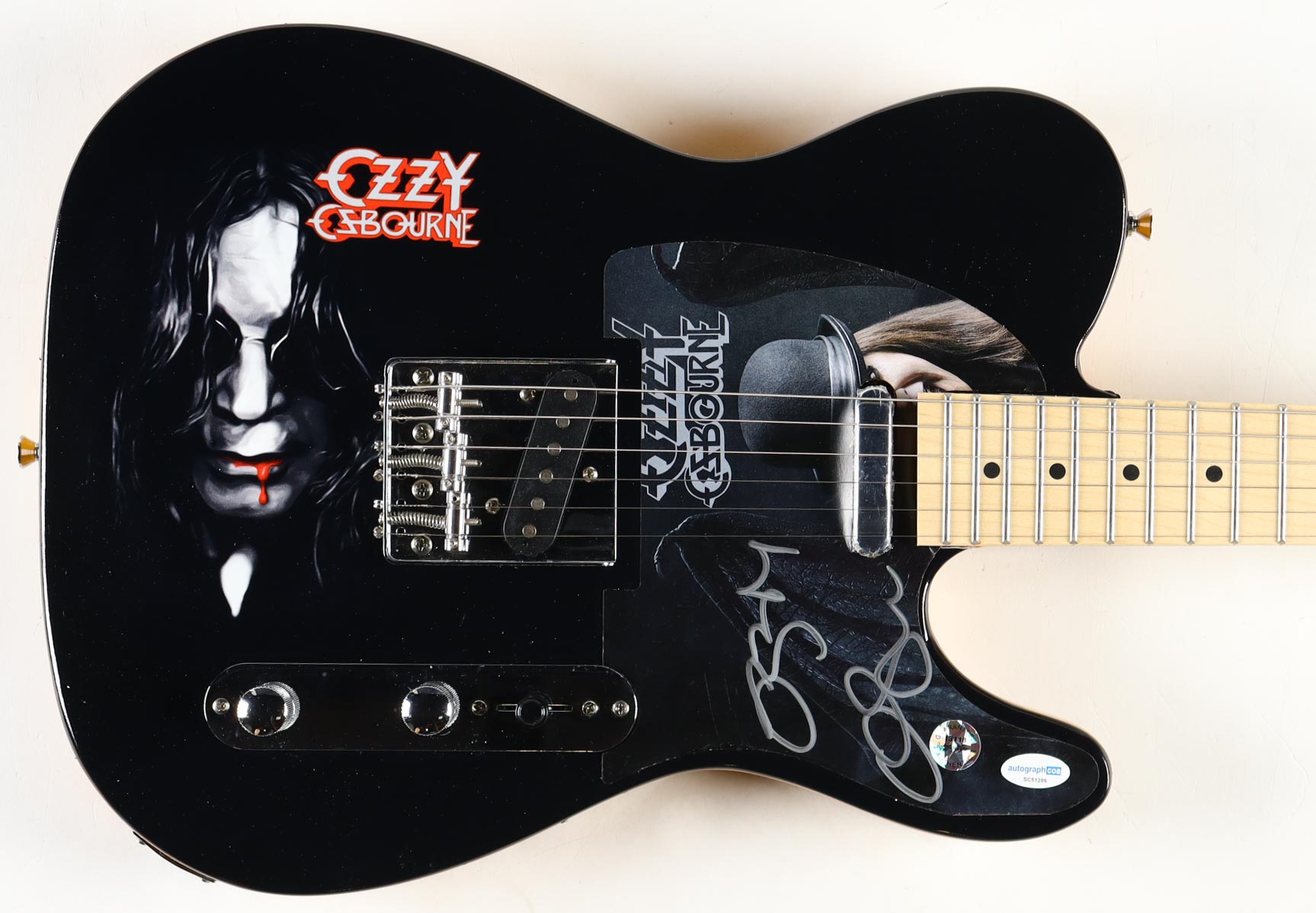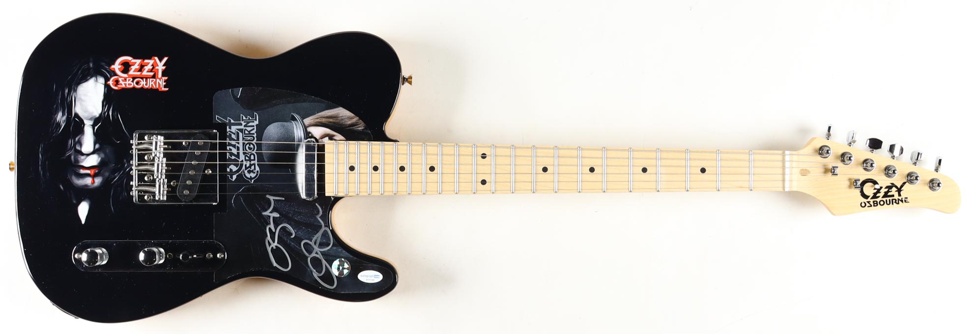 Glarry full-size electric guitar has been hand-signed on the pick-guard by Ozzy Osbourne. Please note, there is some scuffing on the body of the guitar.