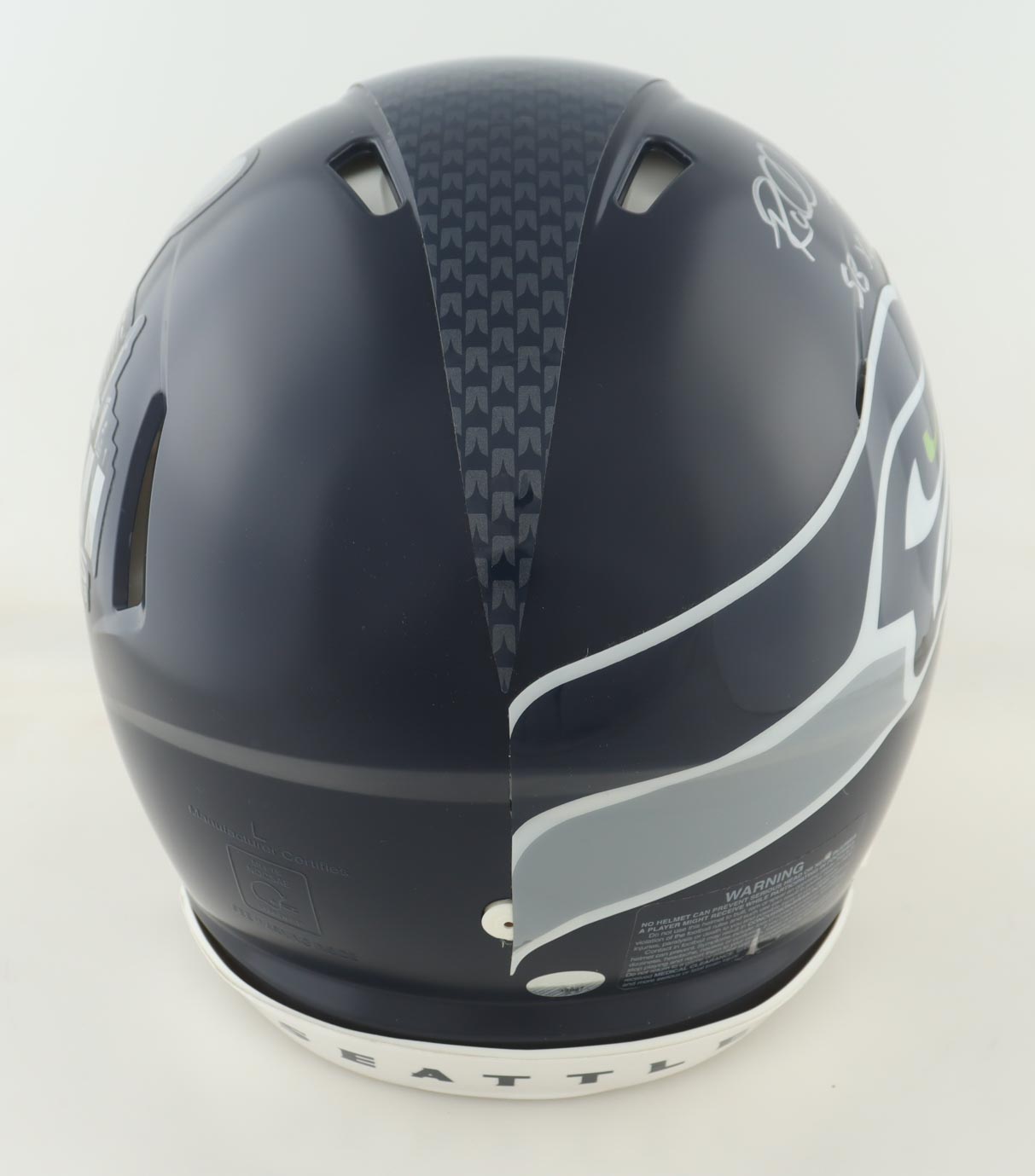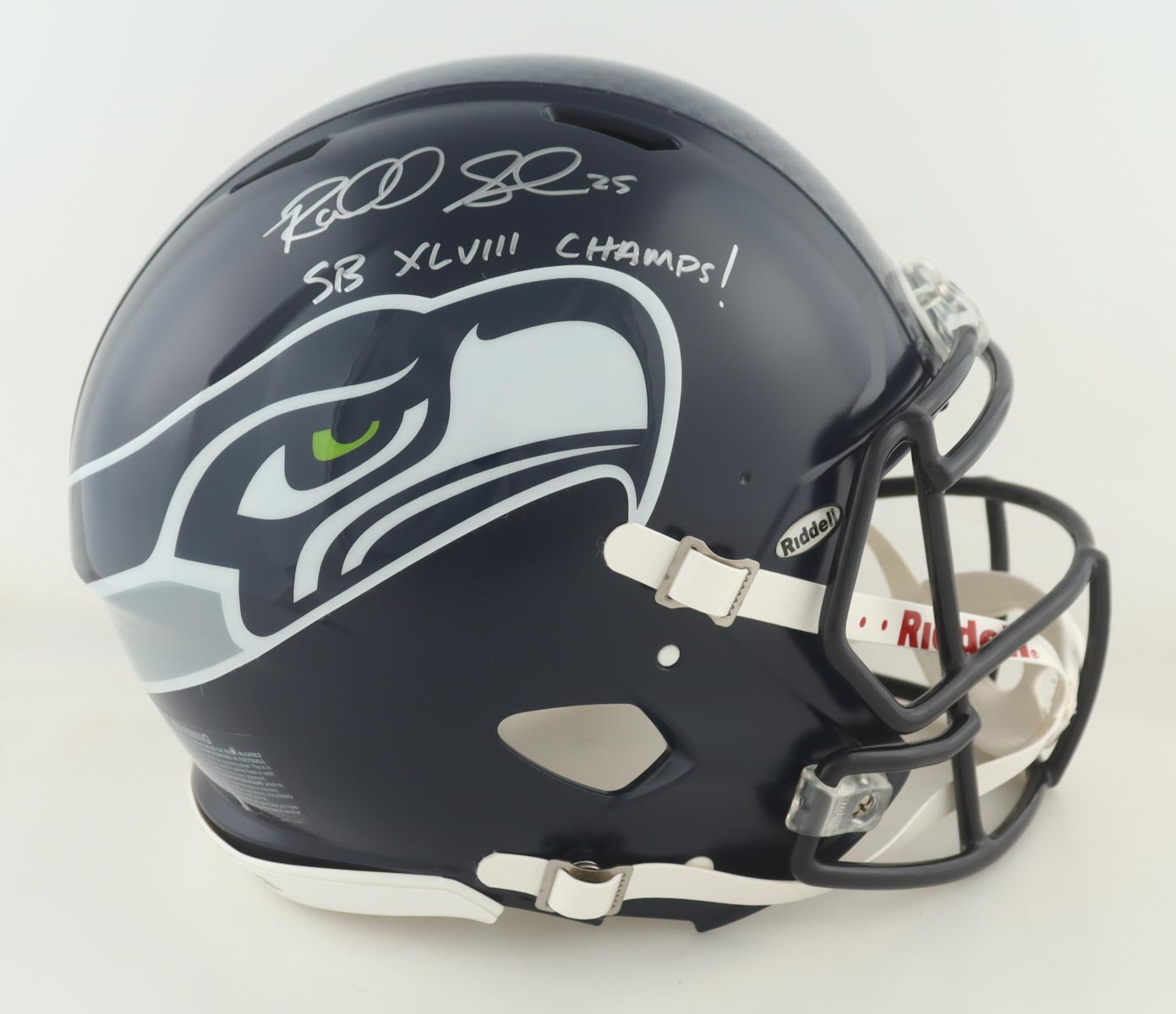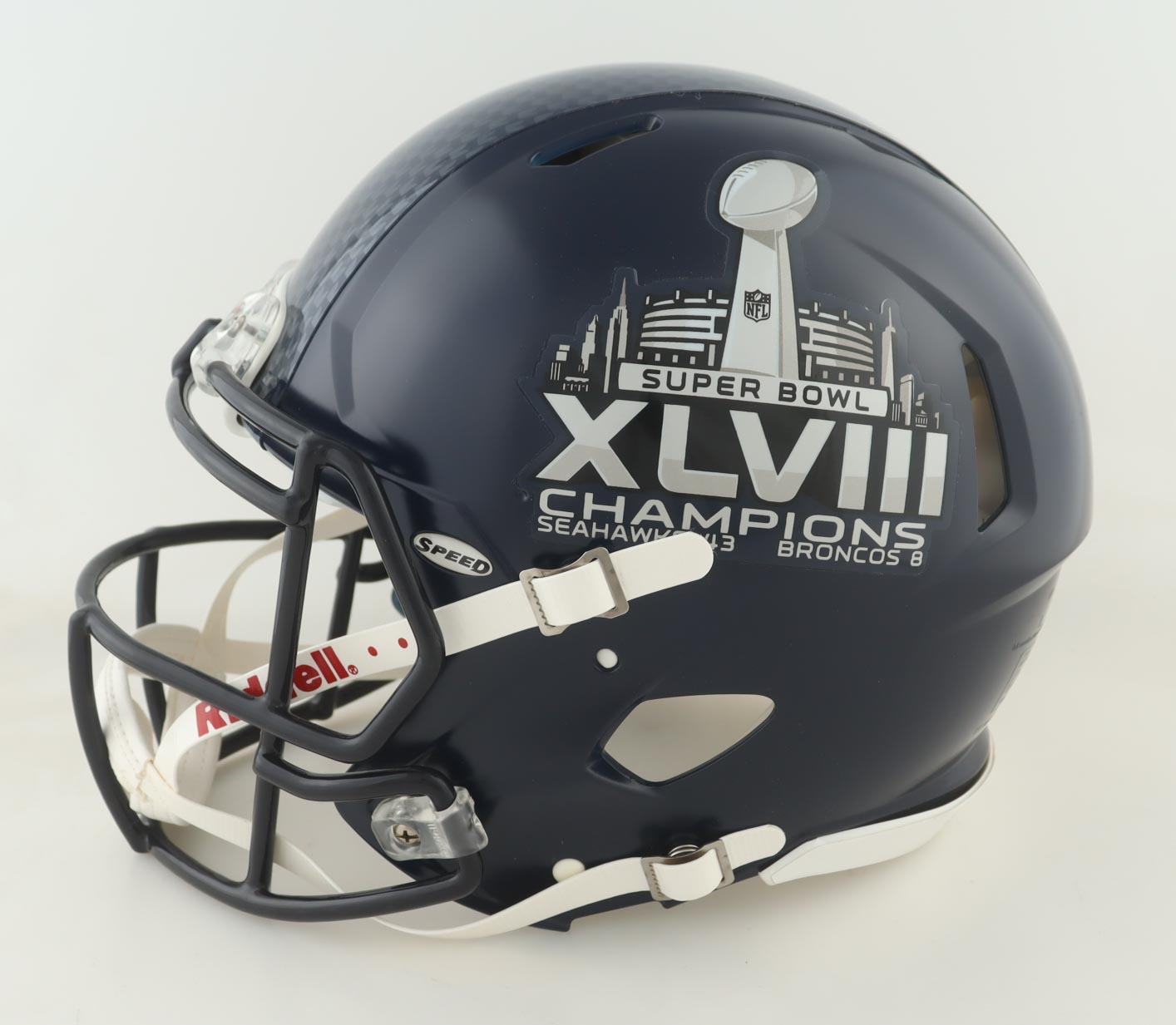 Riddell Seattle Seahawks 2013 Super Bowl XLVIII Champions full-size authentic on-field speed helmet. Hand-signed and inscribed by Richard Sherman (Seattle Seahawks).