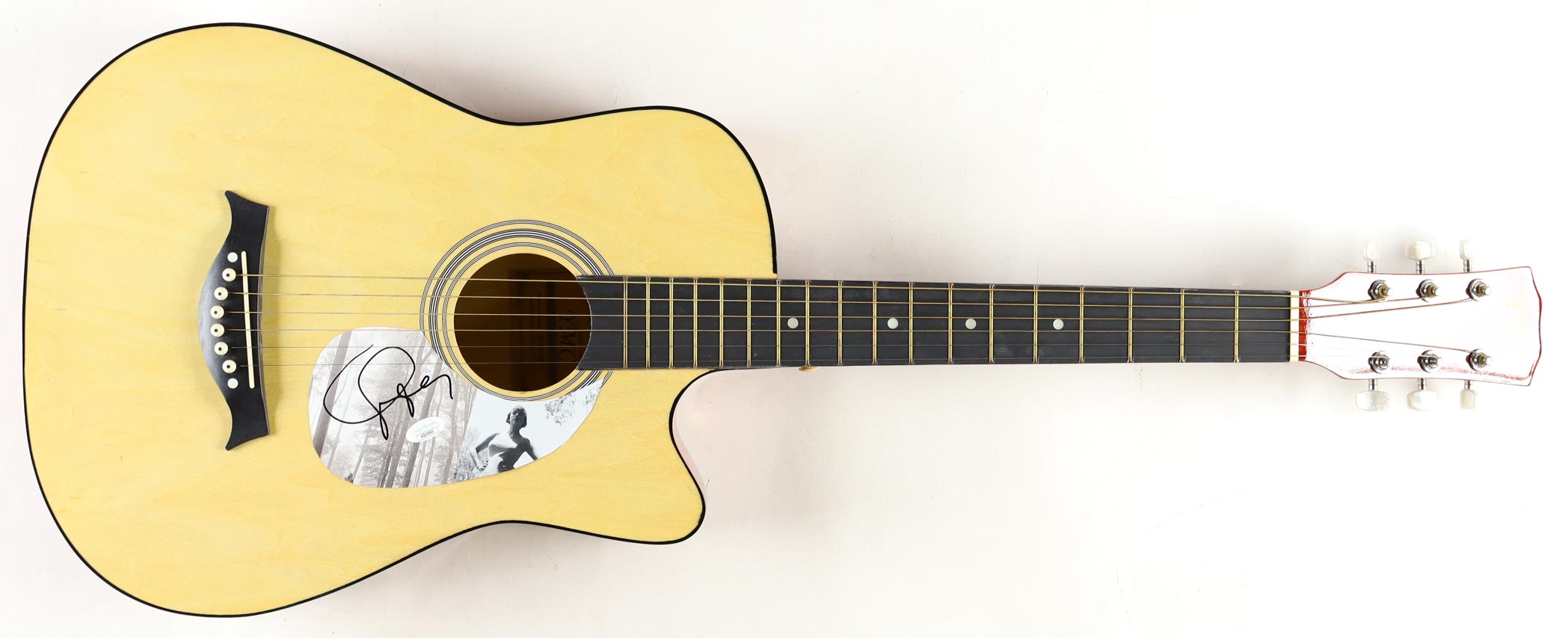 YMC beginner Acoustic guitar measures approximately 38" in length and has been hand-signed on a CD cover that has been repurposed as a pick-guard by Taylor Swift.
