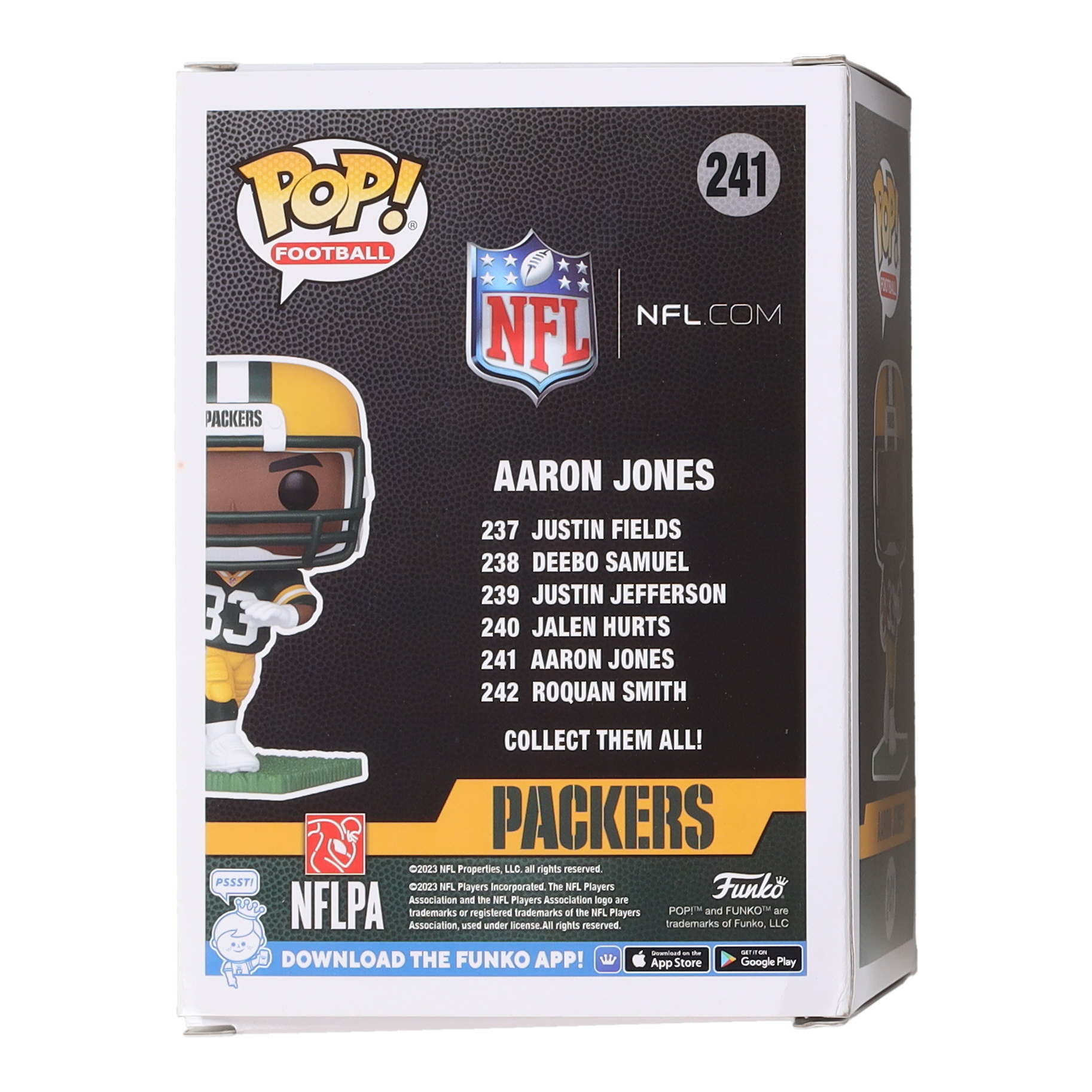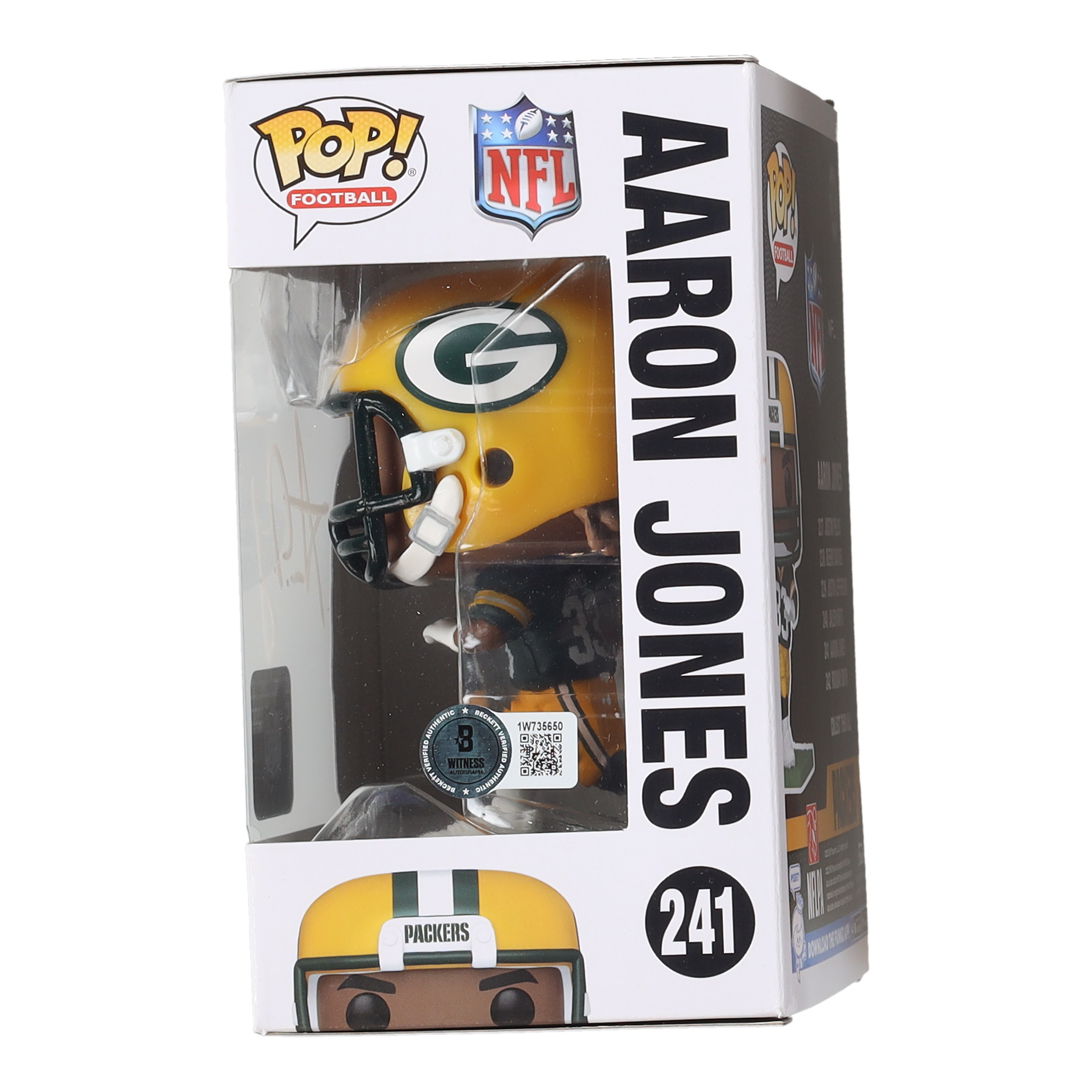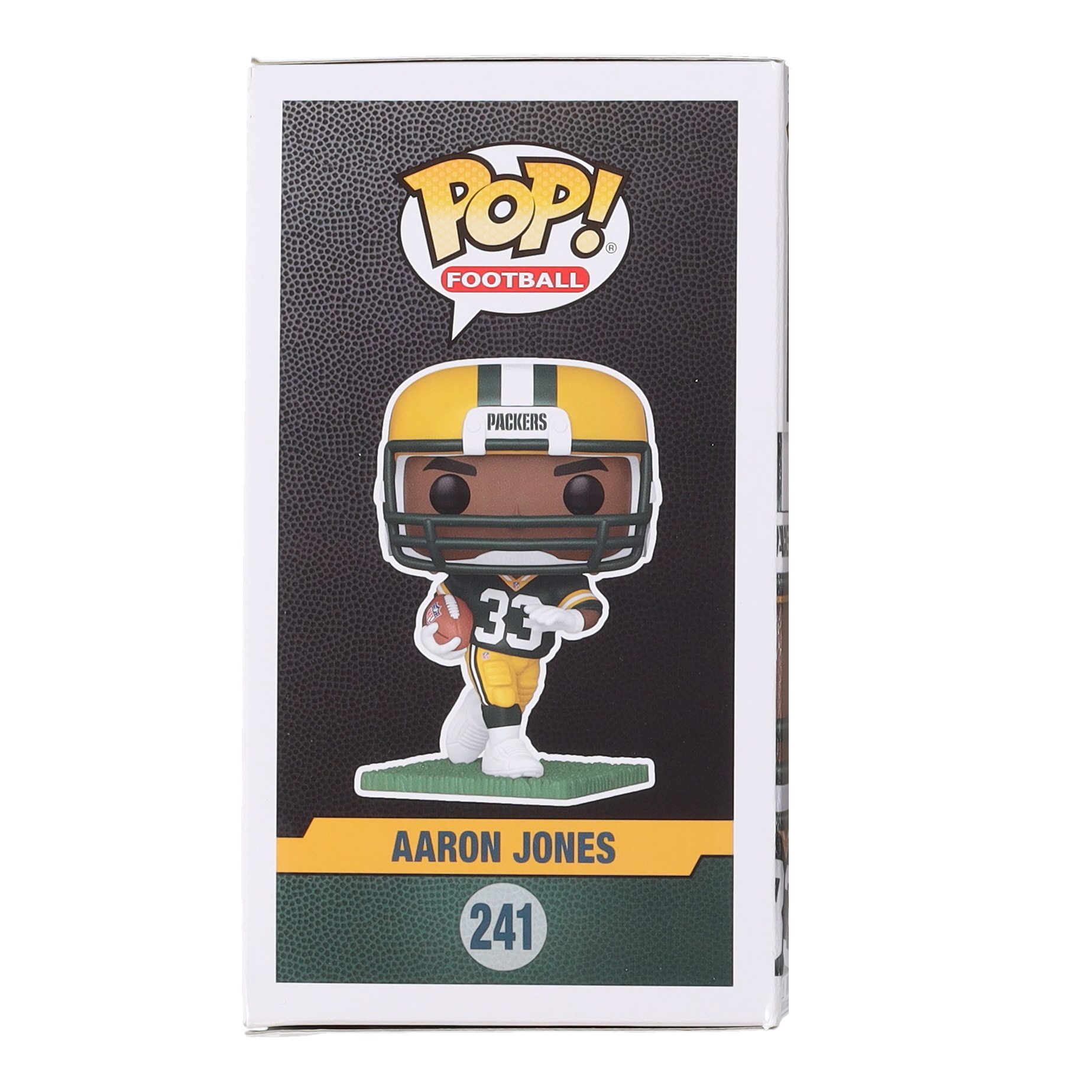 Figure measures approximately 4" tall and has been hand-signed on the packaging by Aaron Jones (Green Bay Packers).