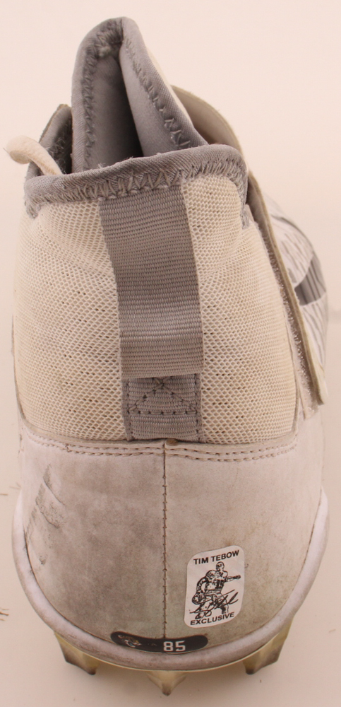 Nike football cleat, size 12.5 comes directly from Tim Tebow's collection and has been hand-signed by Tim Tebow (Denver Broncos). Please note, there is scuffing and staining on the cleat. It is unknown if it was used in practice or a game.