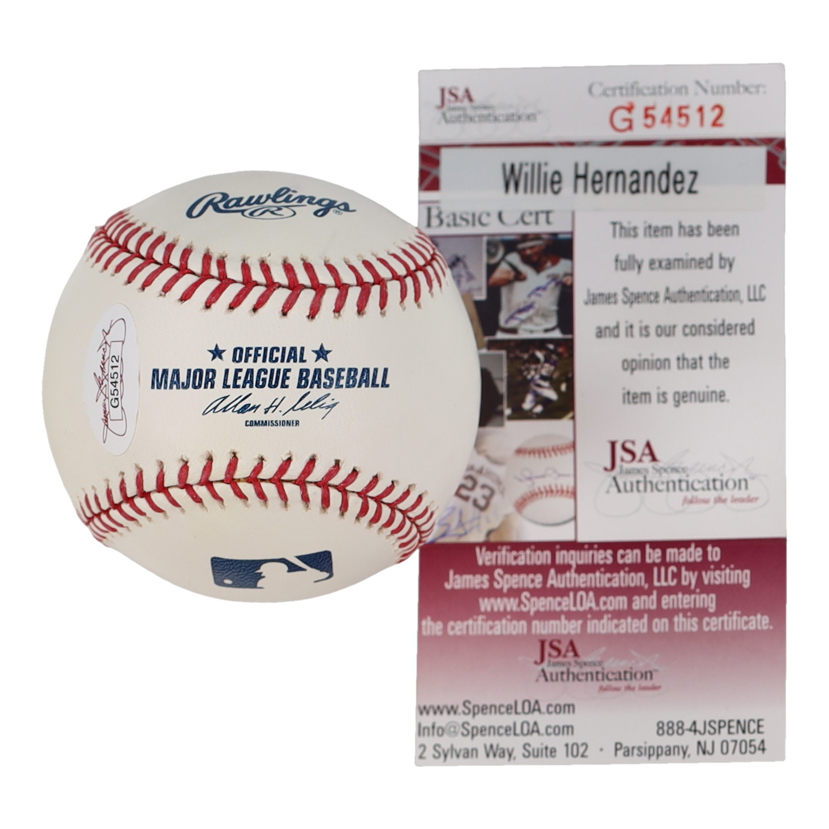 Rawlings Official Major League Baseball. Hand-signed and inscribed by Willie Hernandez (D. 2023, Detroit Tigers). Please note, the baseball is naturally toned and stained.