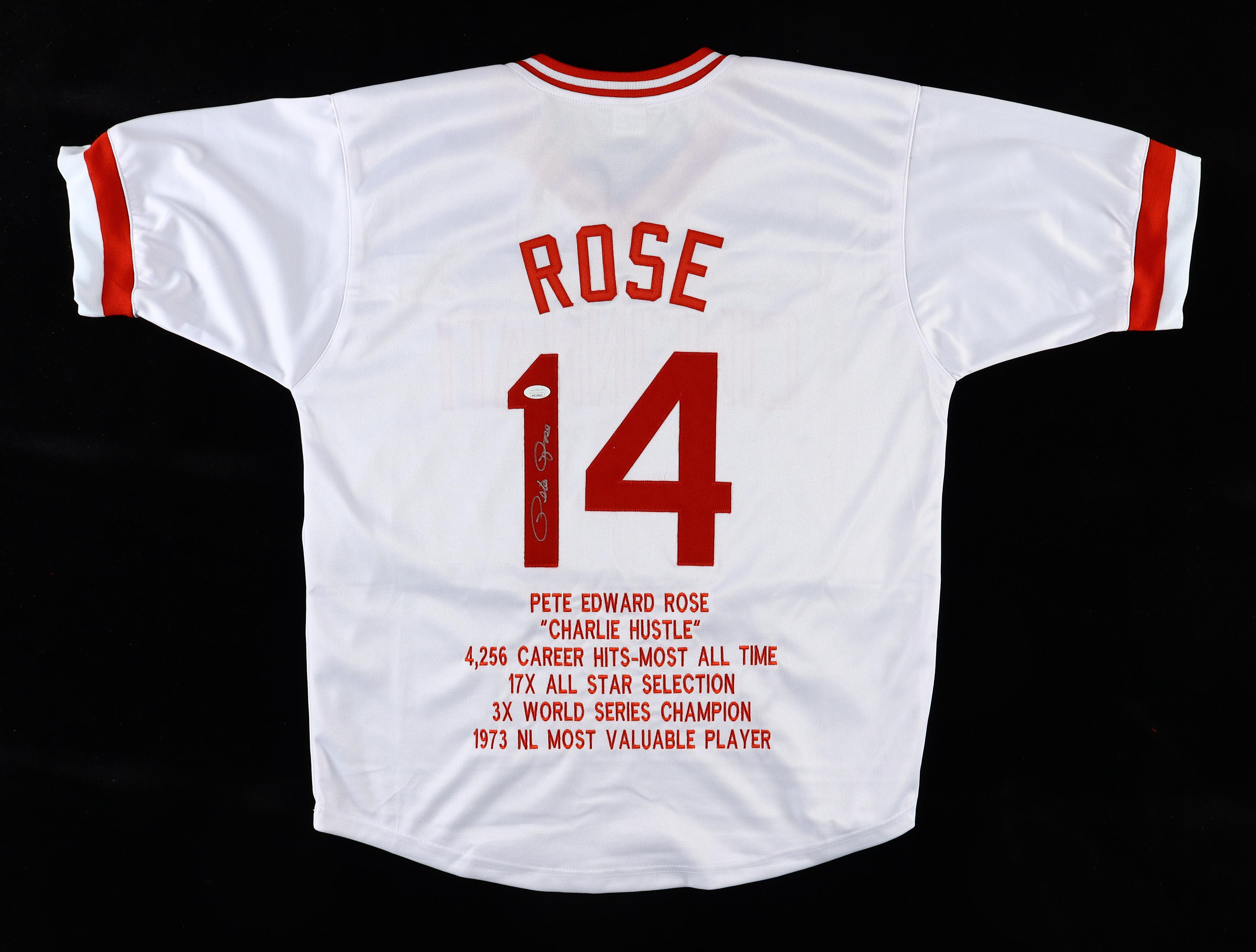 Custom jersey. Everything is sewn on, size XL. Hand-signed by Pete Rose (Cincinnati Reds). Rose's career highlights have been custom stitched onto the back of the jersey below the reverse numbers.