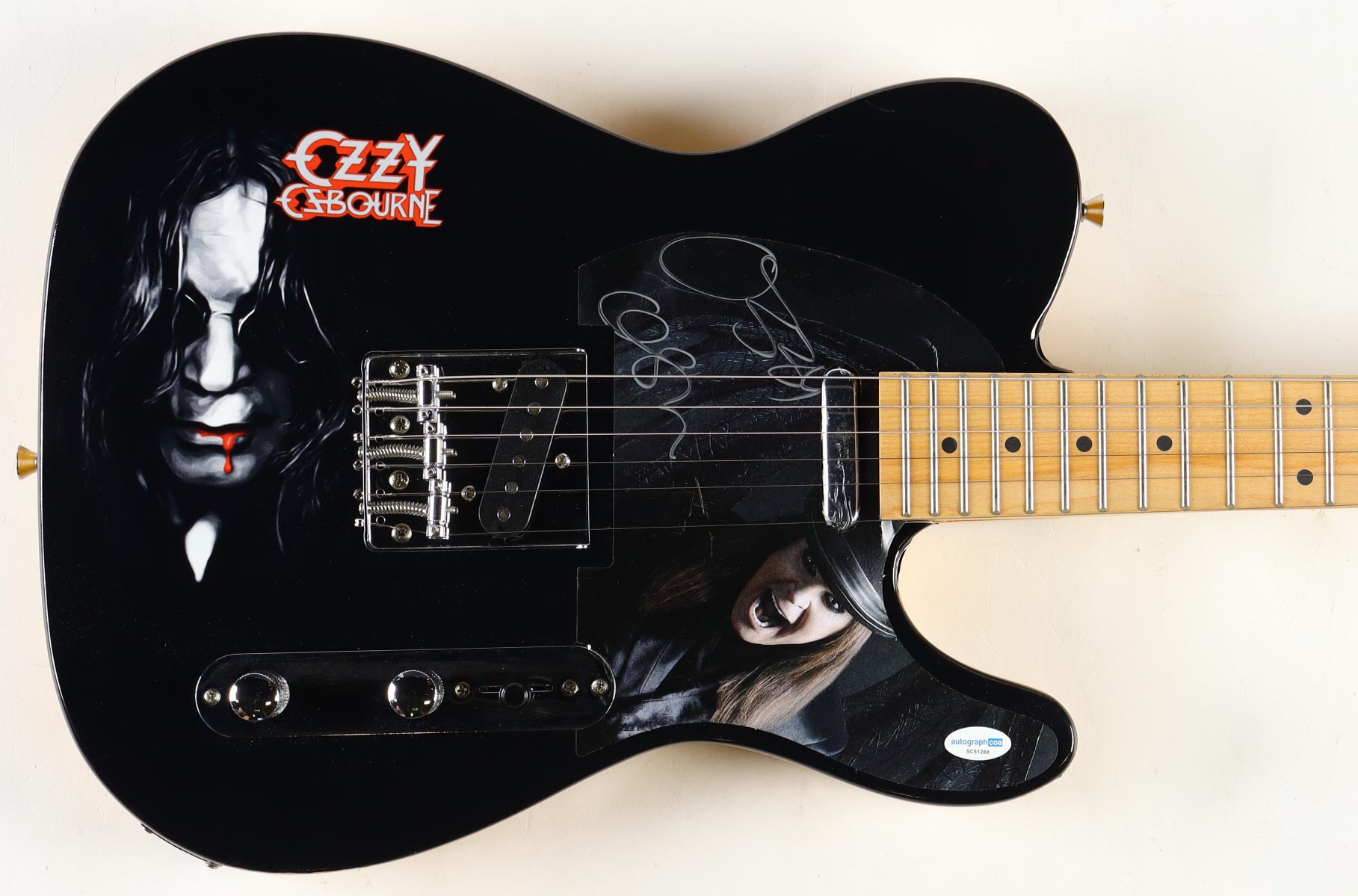 Full-size electric guitar has been hand-signed on the pick-guard by Ozzy Osbourne.