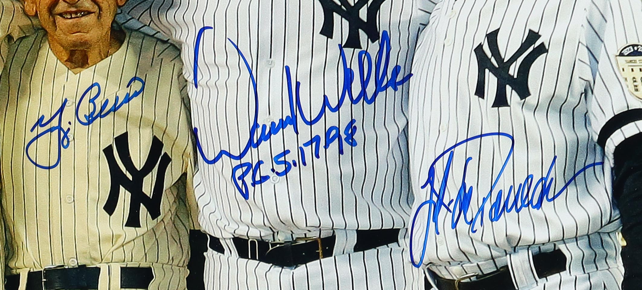 Custom framed display measures approximately 22" x 26" in size and features a photo that has been hand signed and inscribed by Joe Girardi, David Cone, Don Larsen, Yogi Berra, David Wells & Jorge Posada.