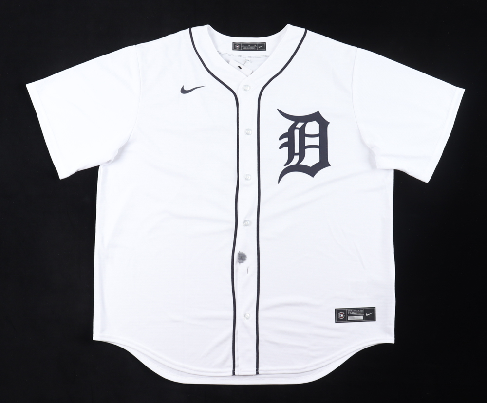 Nike jersey. Everything pressed on, size XL. Hand-signed by Riley Greene (Detroit Tigers). Please note, there is a stain on the front and back of the jersey.