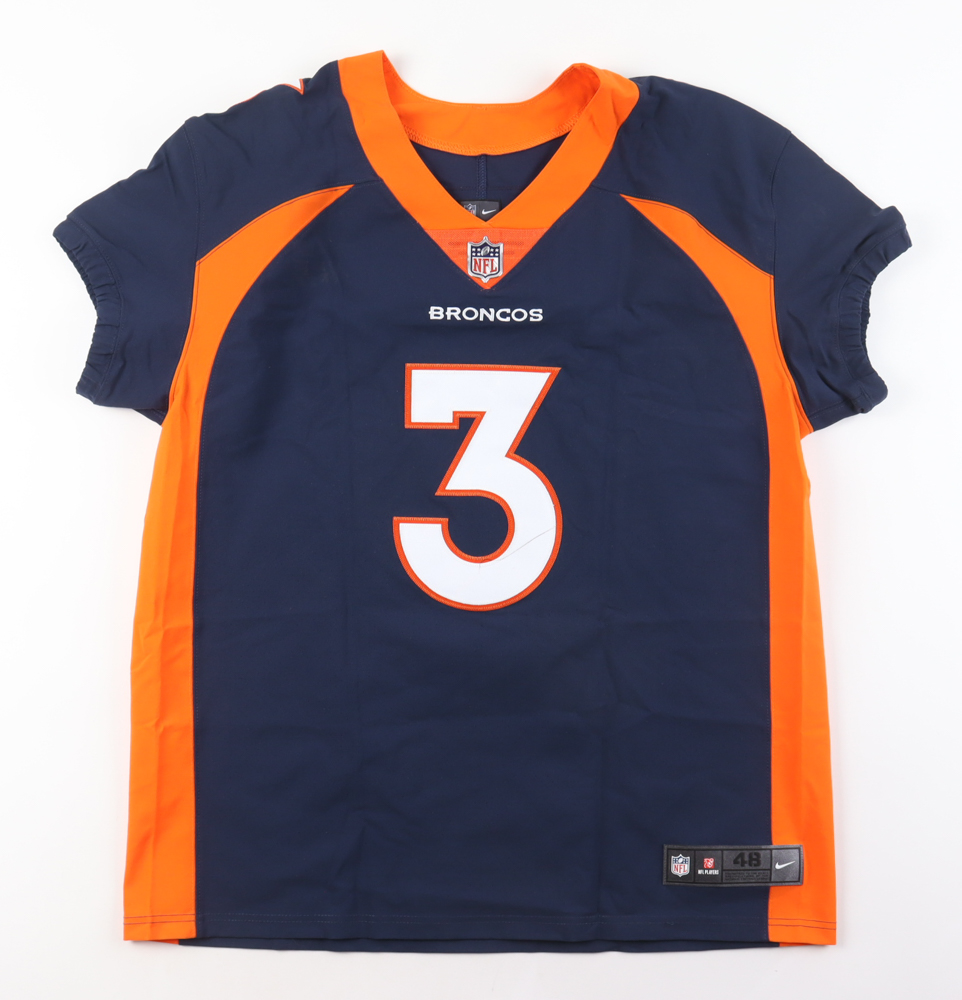 Nike jersey. Everything is sewn on, size 48. Hand-signed by Russell Wilson (Denver Broncos). Please note, there is a stray ink mark on the front number and a stain around the hologram.
