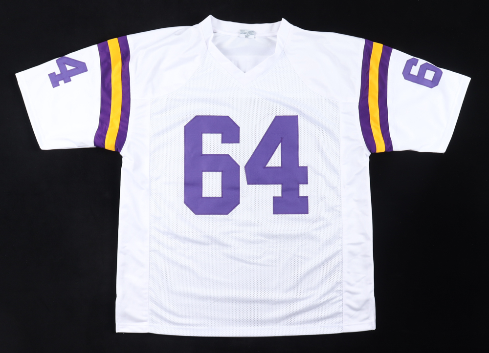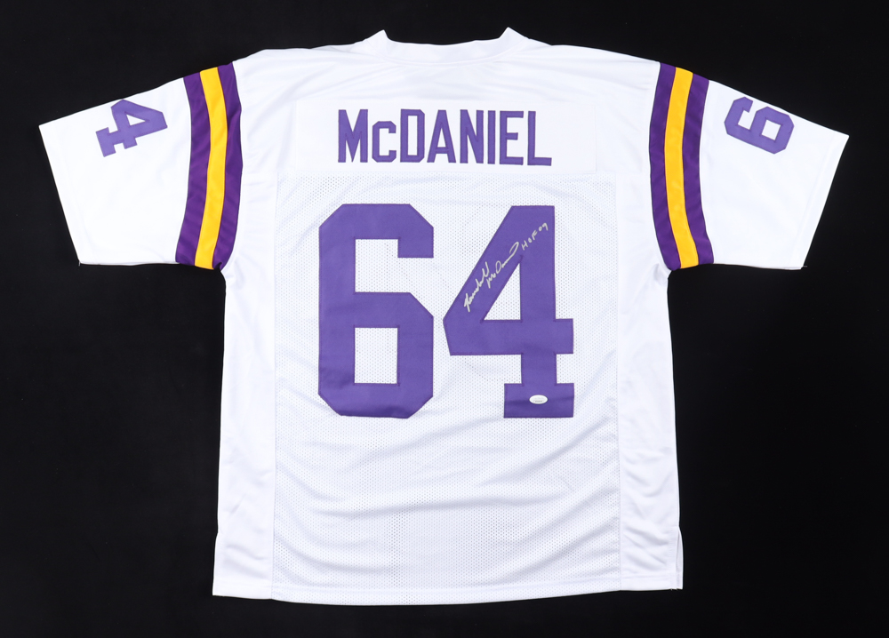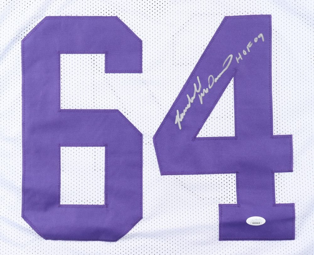 Custom jersey. Everything sewn on, size XL. Hand-signed and inscribed by Randall McDaniel (HOF).