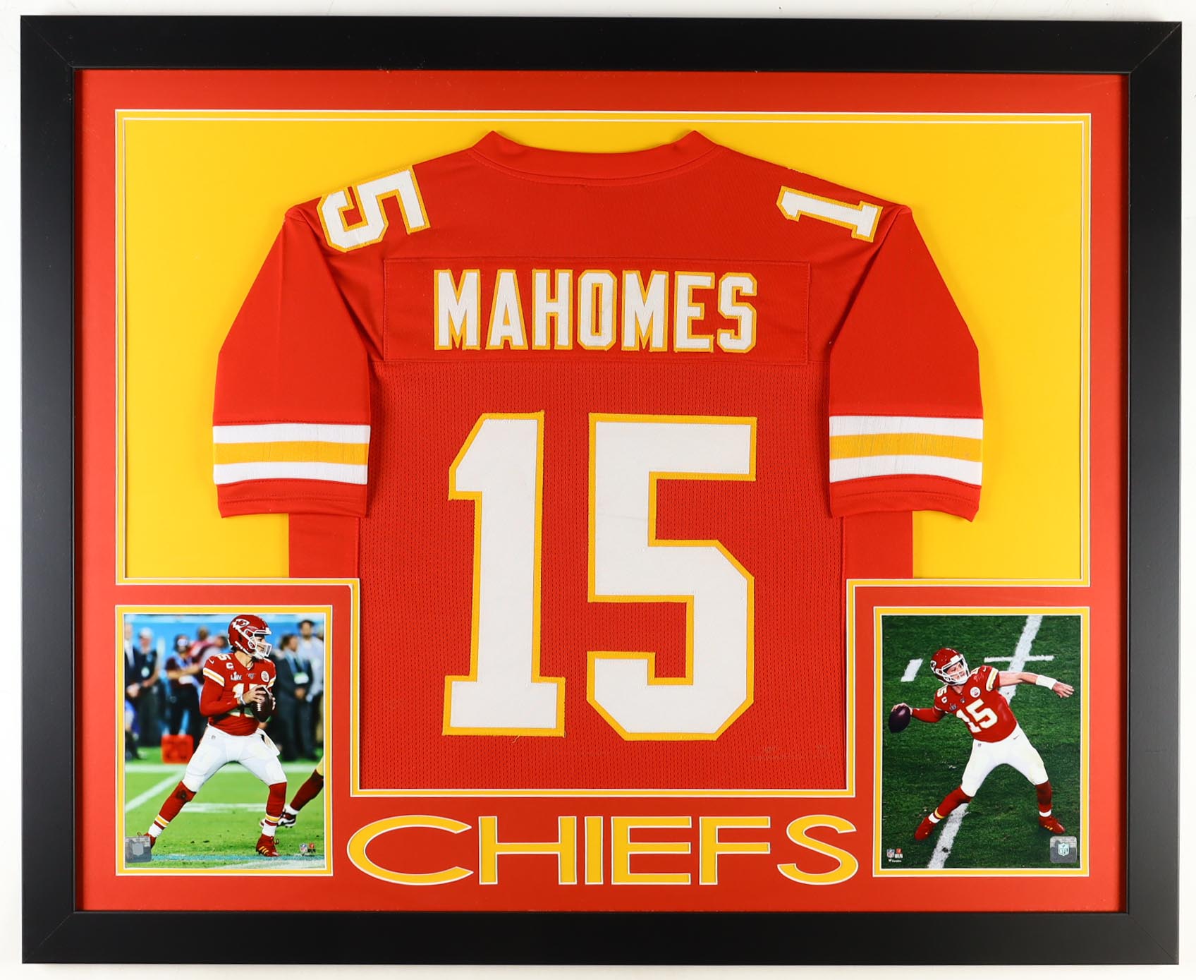 Custom frame measures approximately 35" x 43" in size and features a Patrick Mahomes jersey. Please note, this jersey is unsigned.