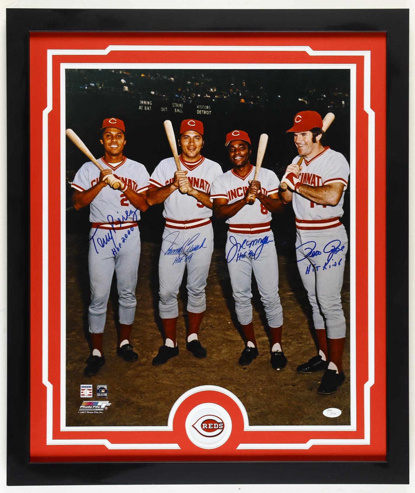 Custom frame measures approximately 22" x 26" in size and features a photo that has been hand-signed and inscribed by Tony Perez (Cincinnati Reds, HOF), Johnny Bench (Cincinnati Reds, HOF), Joe Morgan (D. 2020, Cincinnati Reds, HOF) and Pete Rose (Cincinnati Reds).