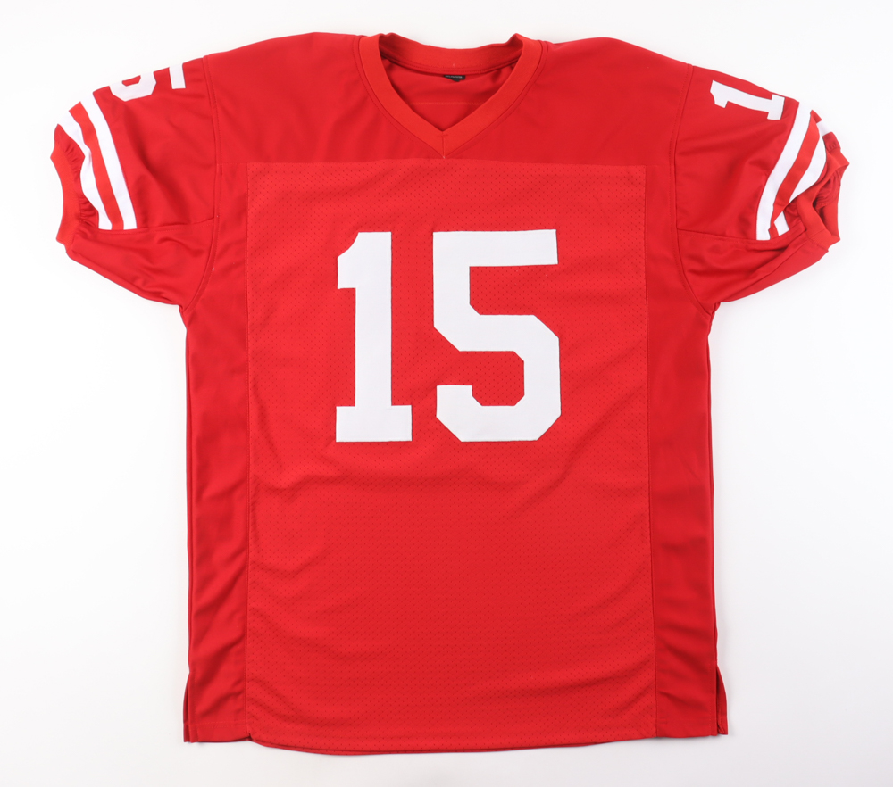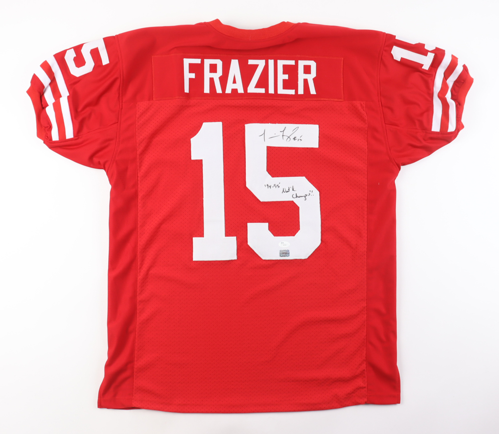 Custom jersey with eerything sewn on, size XL. Hand-signed and inscribed by Tommie Frazier.