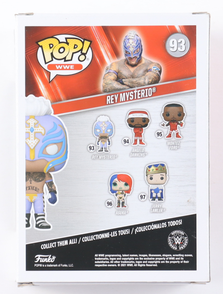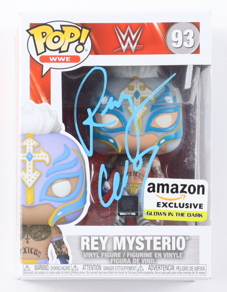 Funko Pop! vinyl figure that measures approximately 4" tall in size and has been hand-signed by Rey Mysterio (HOF). Please note, the top of the box is creased.