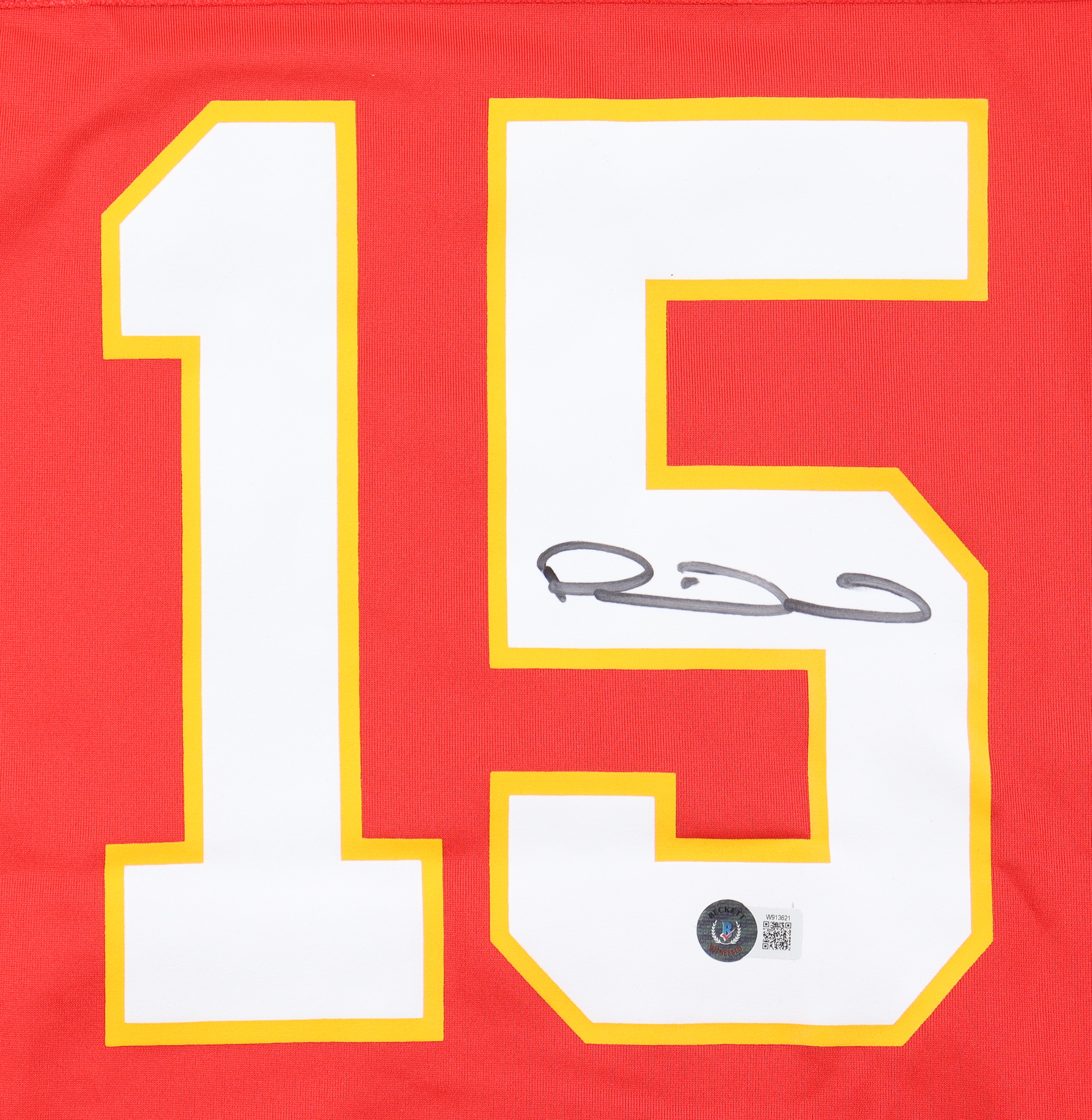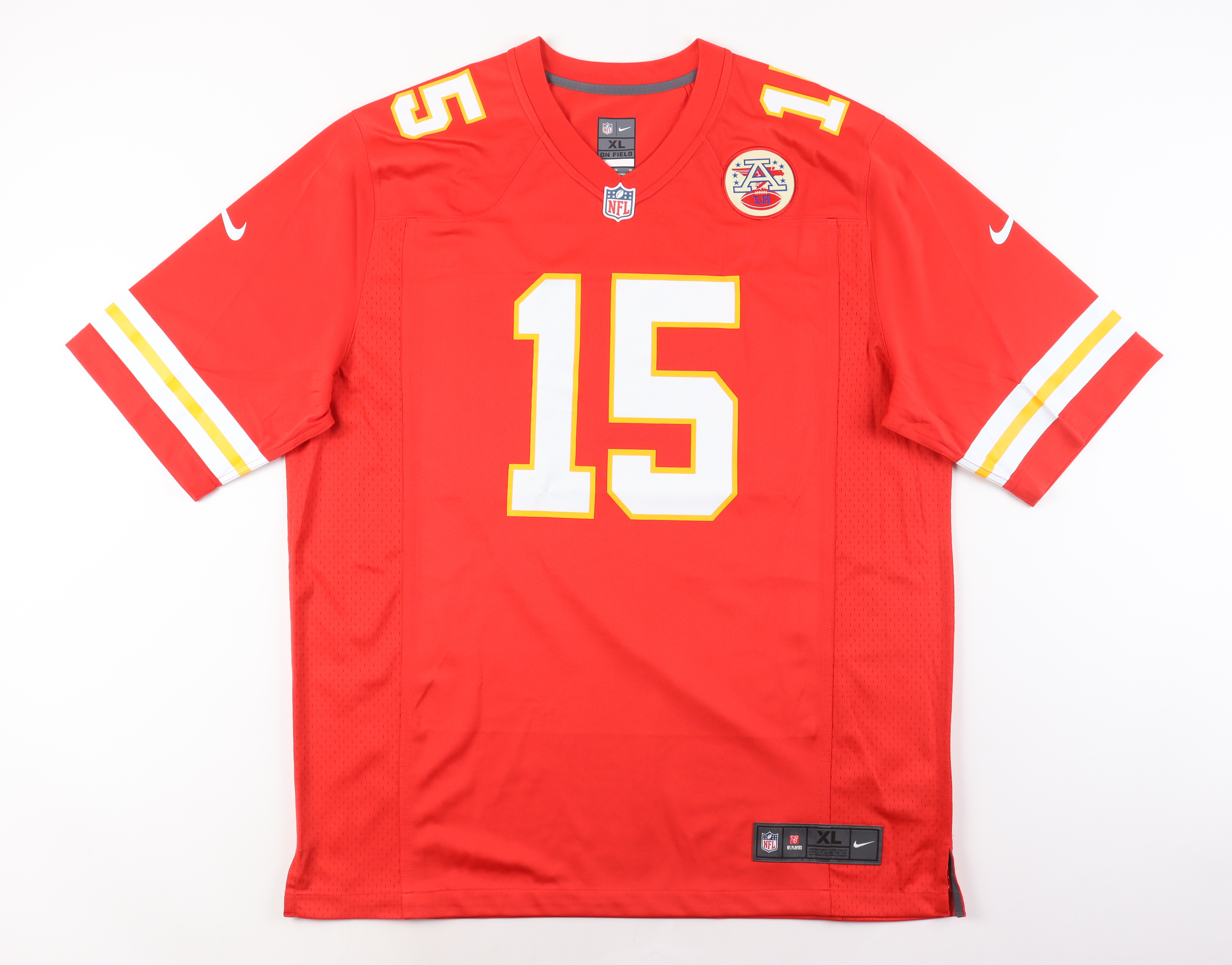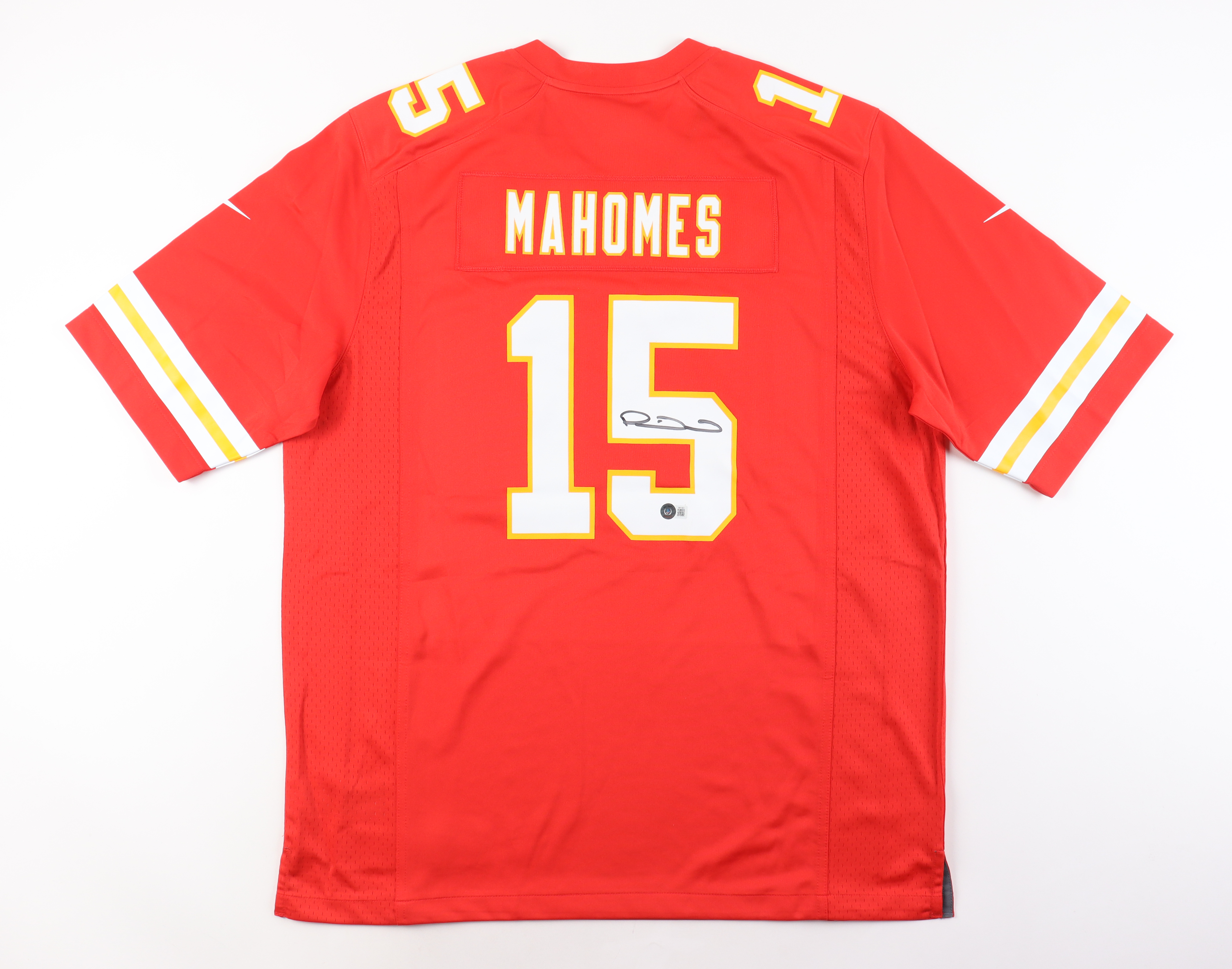 Nike style jersey with everything pressed on, size XL. Hand-signed by Patrick Mahomes II (Kansas City Chiefs). Please note, there is a small black stain on the front numbers.