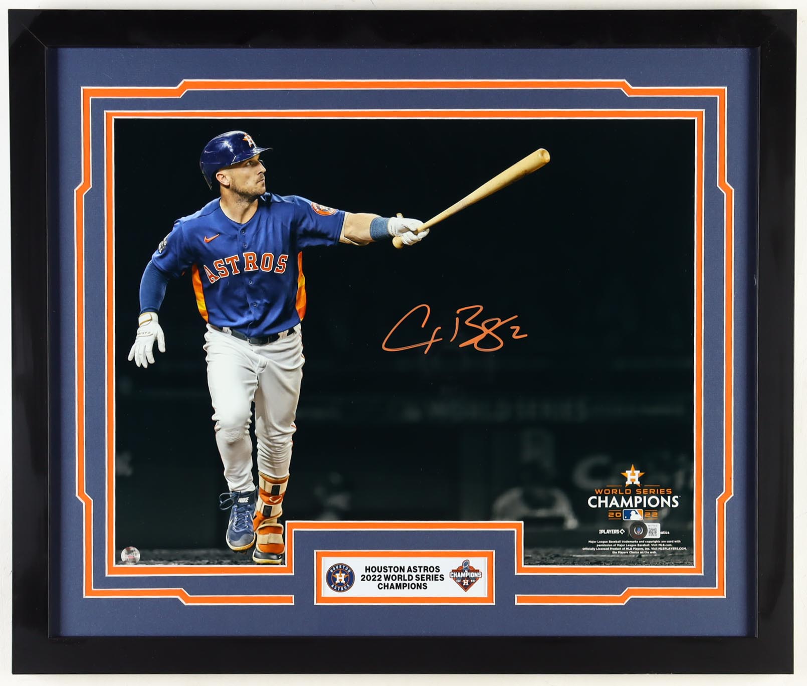 Custom frame measures approximately 22" x 26" in size. Features a photo that has been hand-signed by Alex Bregman (Houston Astros). Please note, there is slight scuffing on the frame.