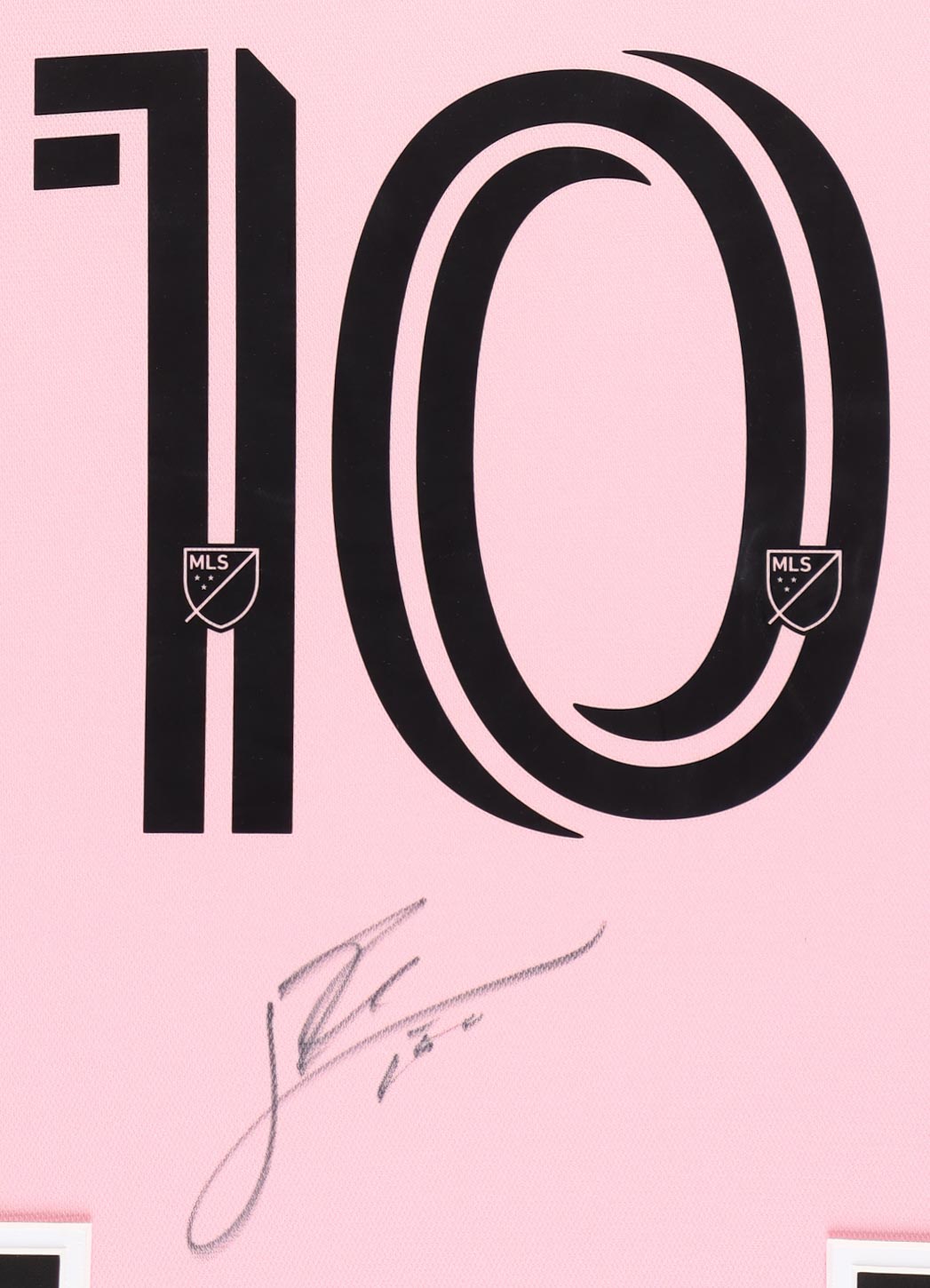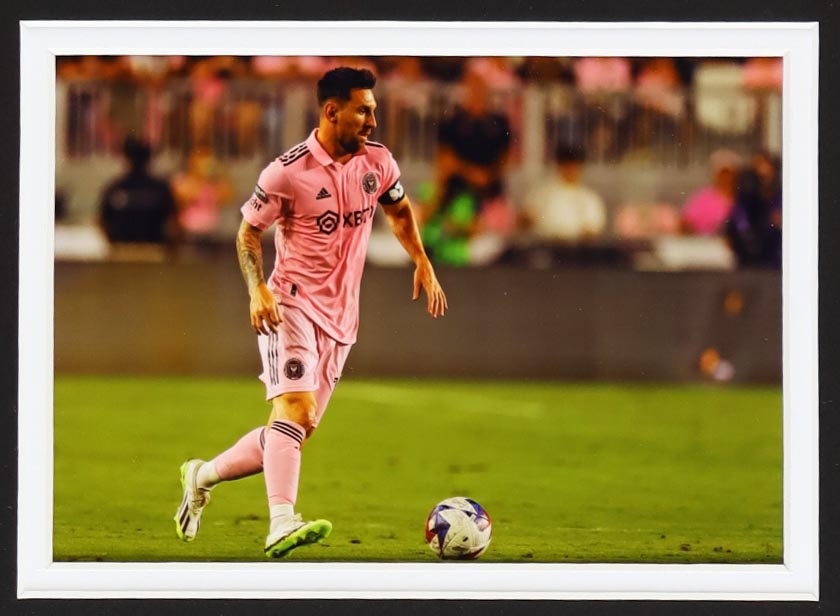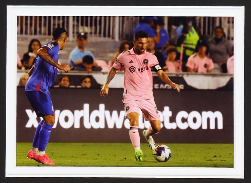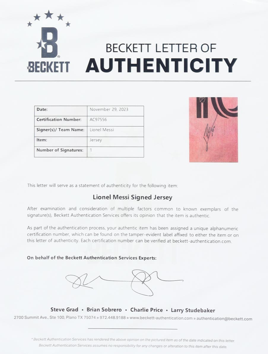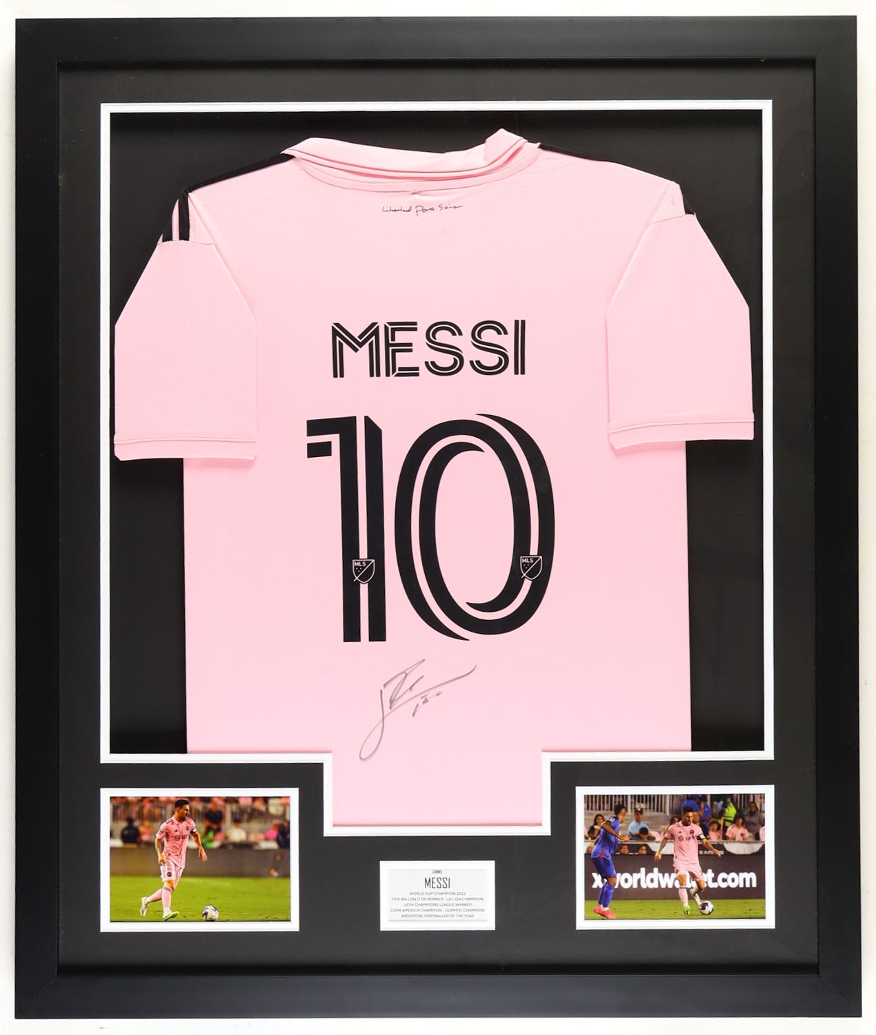 Custom framed display measures approximately 30.25" x 35.5" in size and features a jersey that has been hand-signed by Lionel Messi.