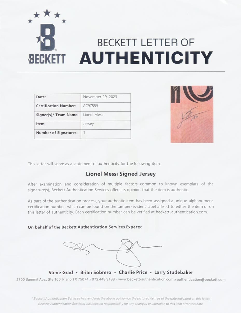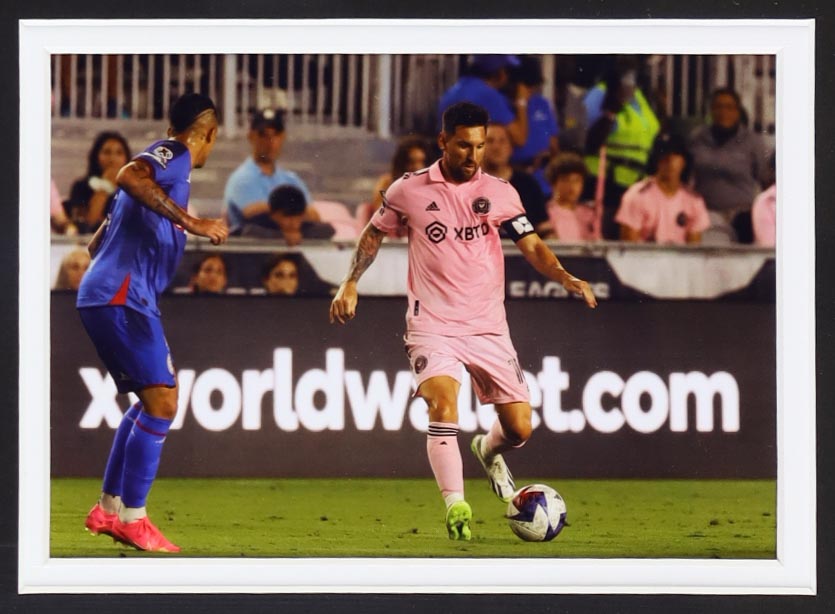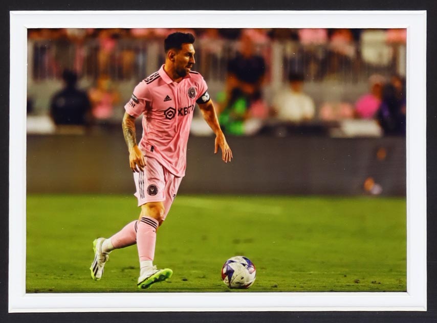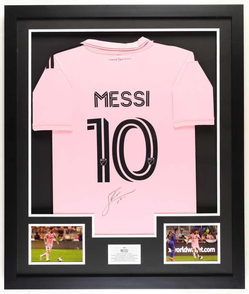 Custom framed display measures approximately 30.25" x 35.5" in size and features a jersey that has been hand-signed by Lionel Messi. Please note, there is some scuffing and corner wear on the frame.