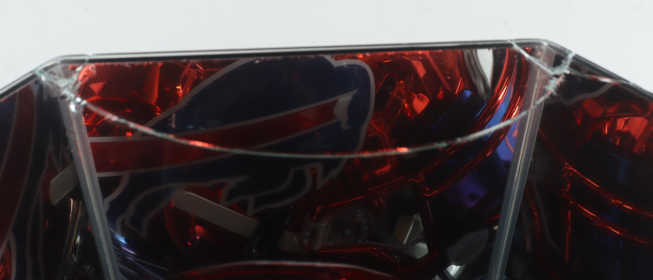 Riddell Buffalo Bills full-size authentic on-field Chrome alternate SpeedFlex helmet with custom visor and has been hand-signed by Josh Allen. The display case is included as shown. Please note, there is cracked glass on the top of the case and some separation along the seams.