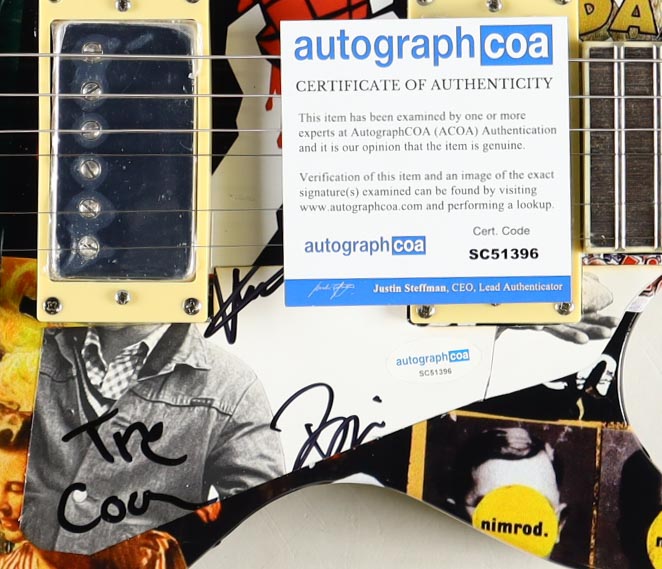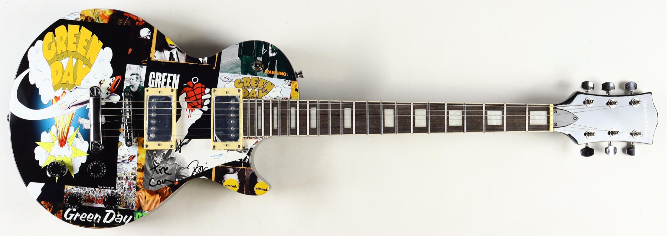 Signature Edition Electric guitar measures 39" has been hand-signed by Billie Joe Armstrong, Mike Dirnt and Tre Cool. Please note the signatures for Armstrong and Dirnt are cut off.