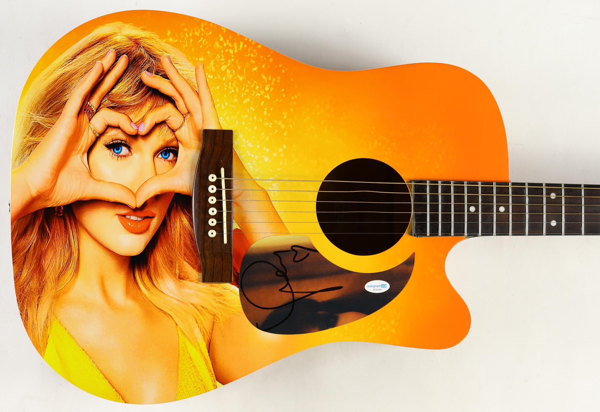 Acoustic guitar measures approximately 41" in length and has been hand-signed on the pickguard by Taylor Swift.