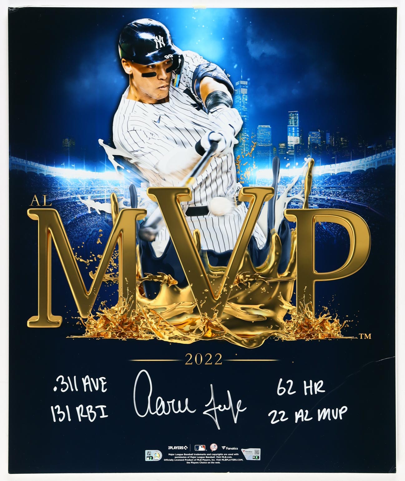 Photo measures 20" x 24" in size and has been hand-signed and inscribed by Aaron Judge (New York Yankees). Please note, there is a big crease on the bottom righthand corner.