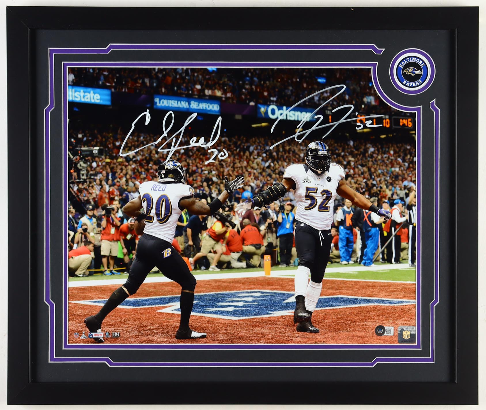 Custom frame measures approximately 22" x 26.25" in size and features a photo that has been hand-signed by Ray Lewis (Baltimore Ravens, HOF) and Ed Reed (Baltimore Ravens, HOF). Please note, there is slight scuffing on the frame.