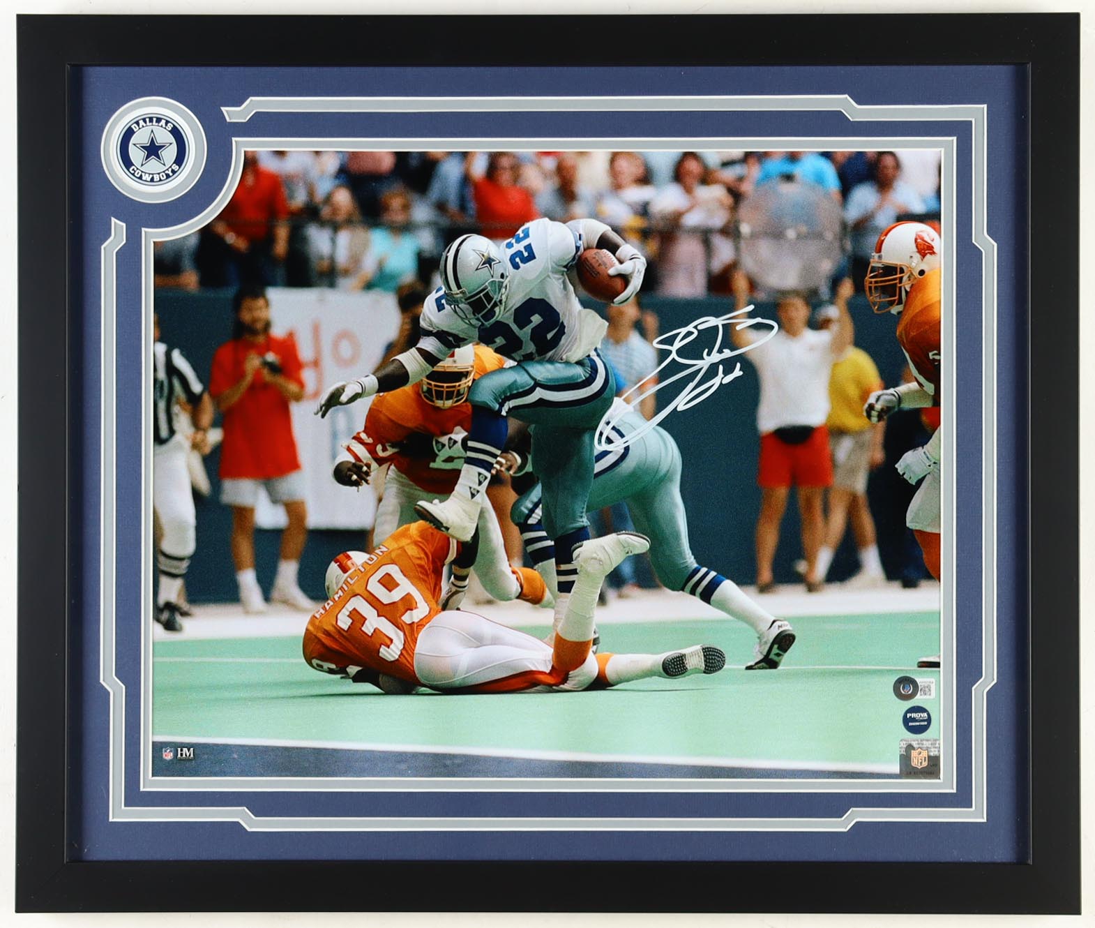Custom frame measures approximately 22" x 26" in size and features a photo that has been hand-signed by Emmitt Smith (Dallas Cowboys, HOF). Please note, there is corner wear on the frame.