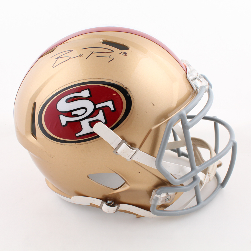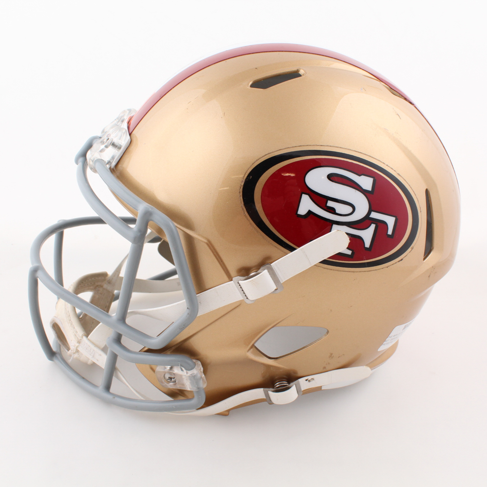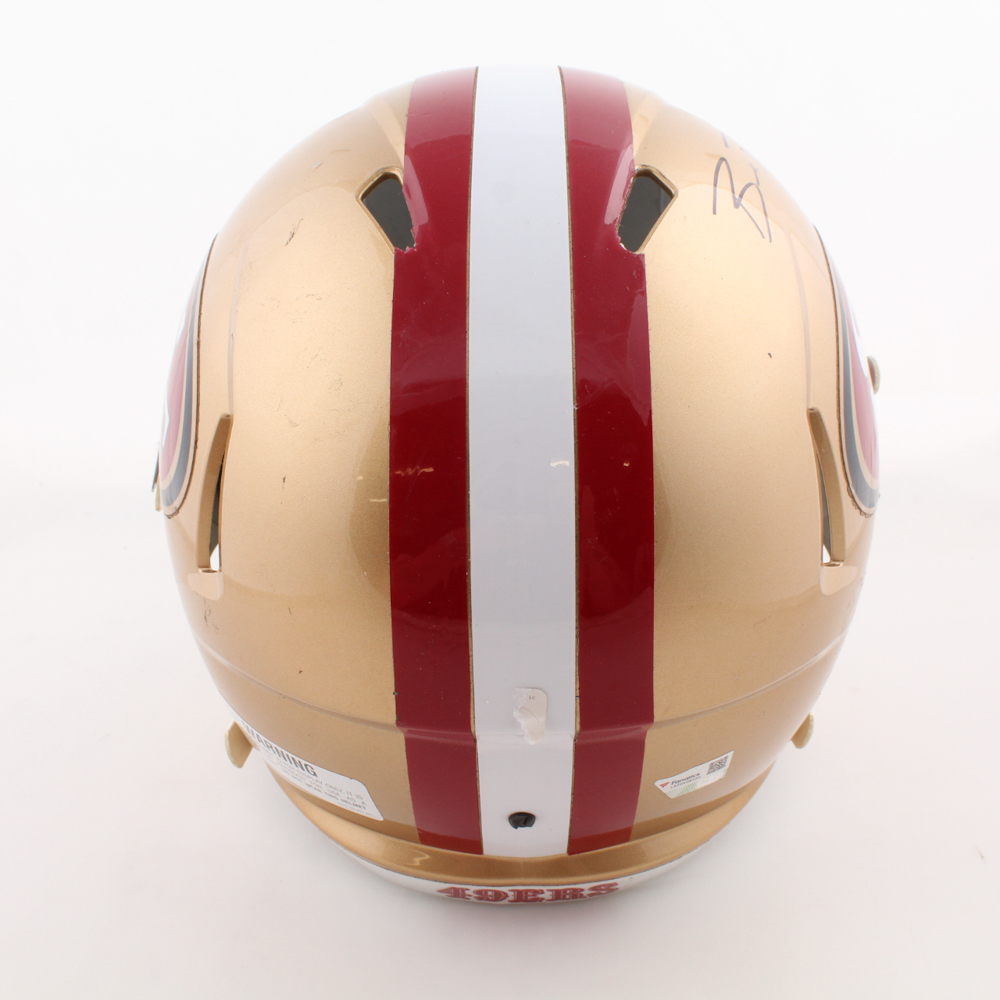 Riddell San Francisco 49ers full-size replica speed helmet. Hand-signed by Brock Purdy. Please note there is damage to the decals on the front of the helmet.