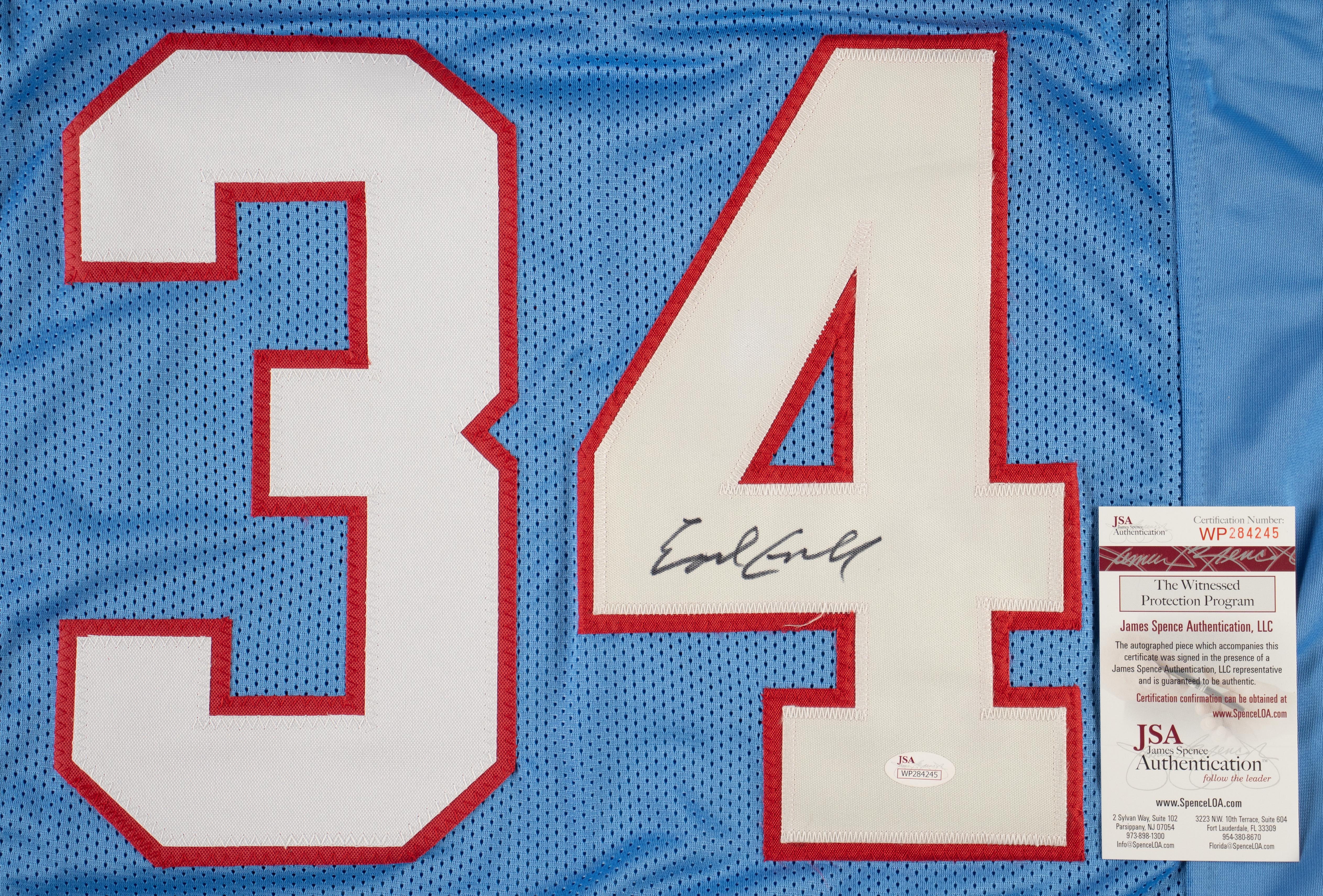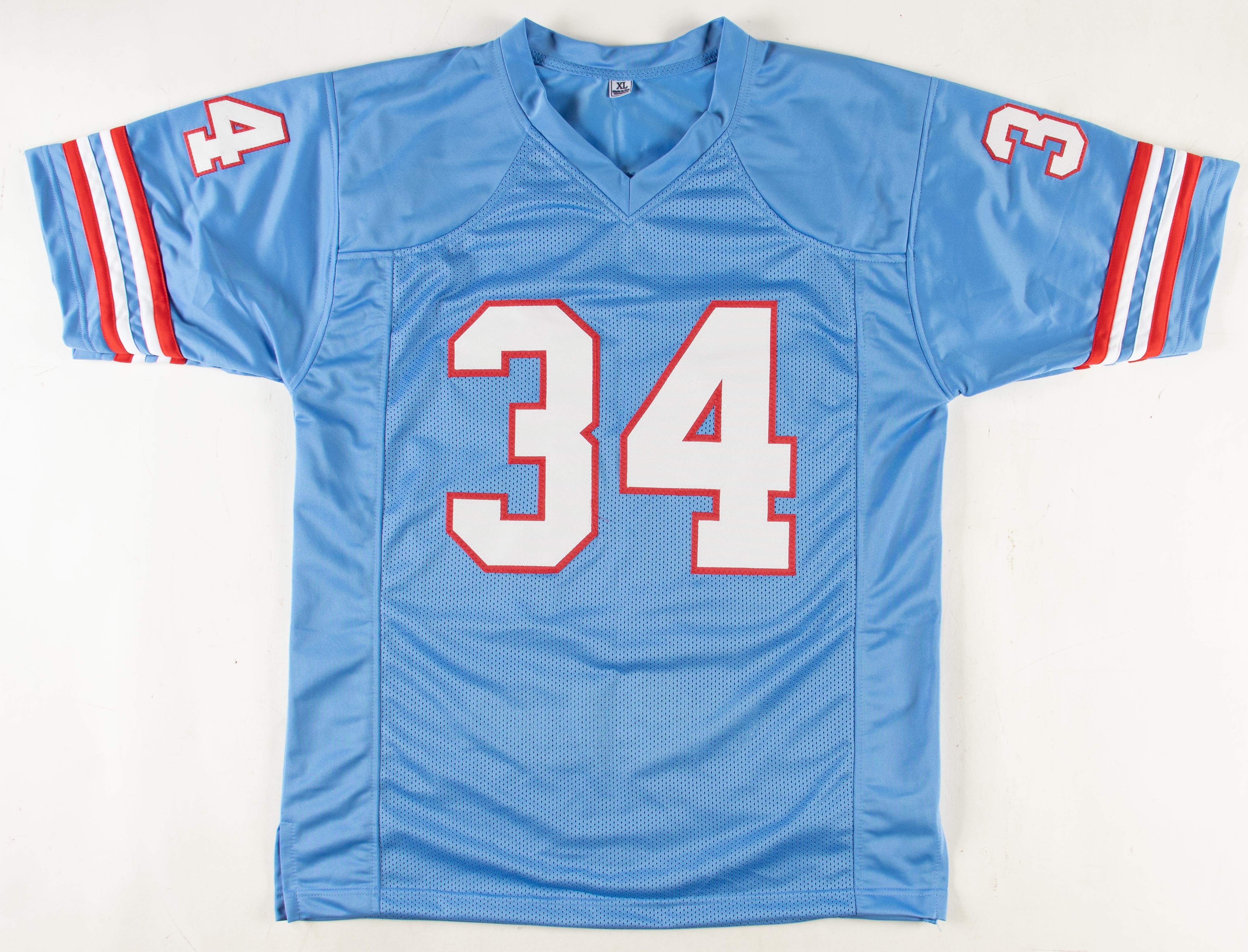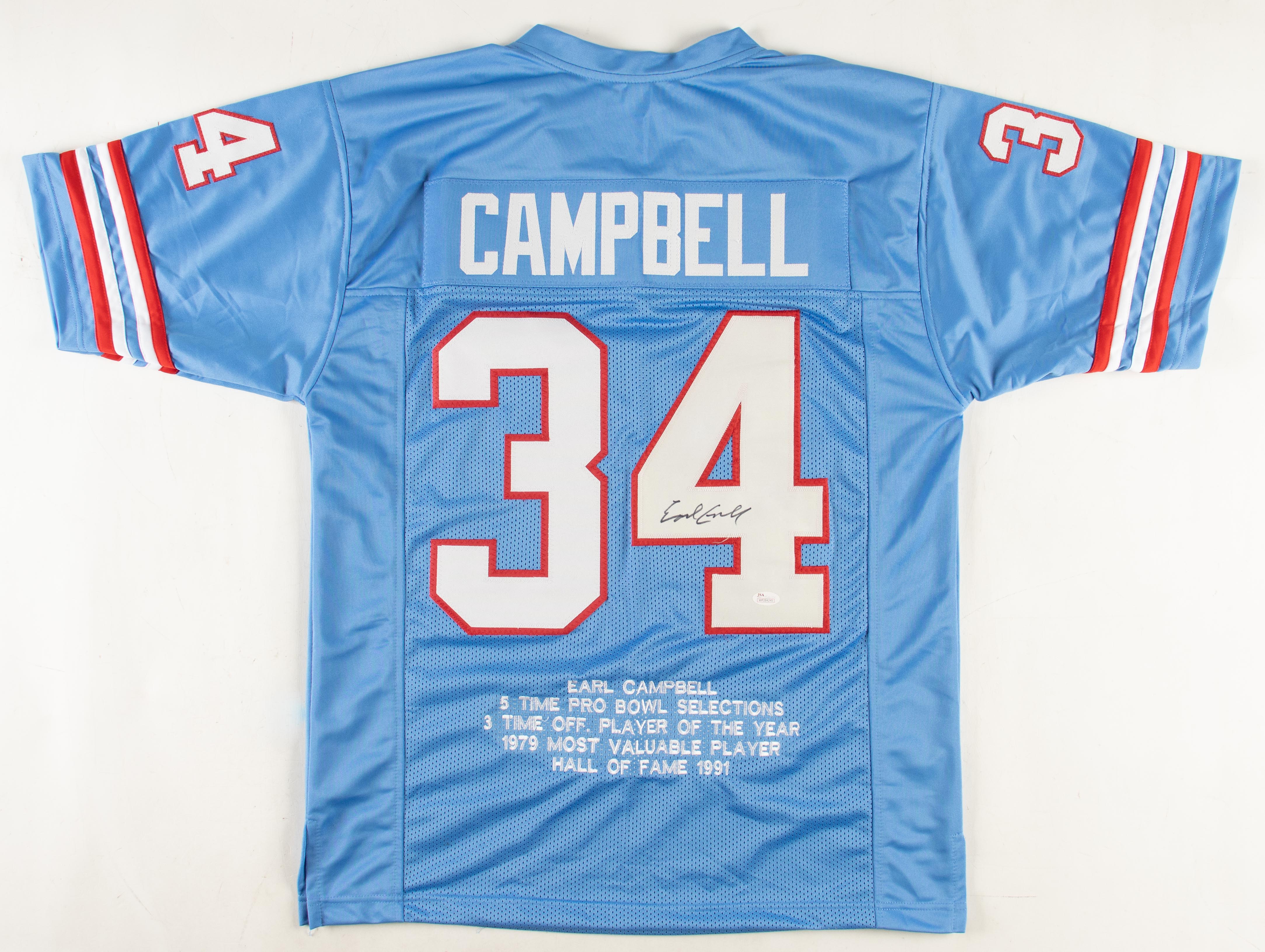 Custom jersey. Everything is sewn on, size XL. Hand-signed by Earl Campbell (HOF, Houston Oilers). Campbell's career highlight stats are custom stitched below the reverse number.