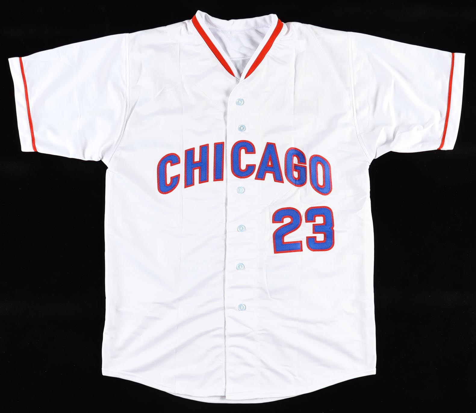 Custom jersey with everything sewn on, size XL. Jersey has been hand-signed and inscribed by Ryne Sandberg (HOF). Sandberg's career highlight stats are custom stitched below the reverse number.