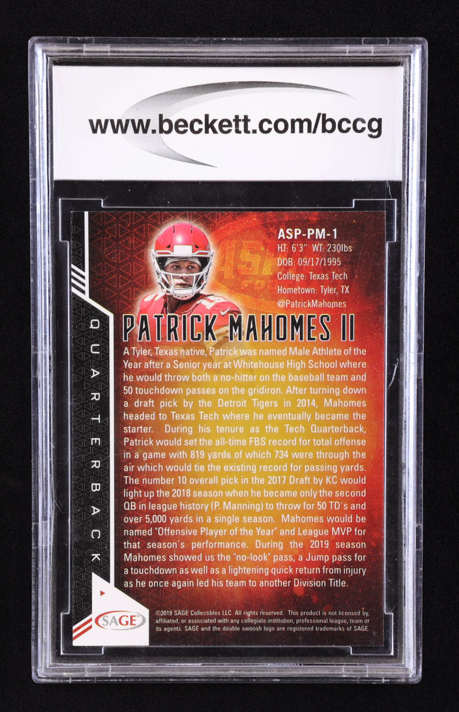Patrick Mahomes II 2019 SAGE Aspire #ASPPM1 (BCCG 10)