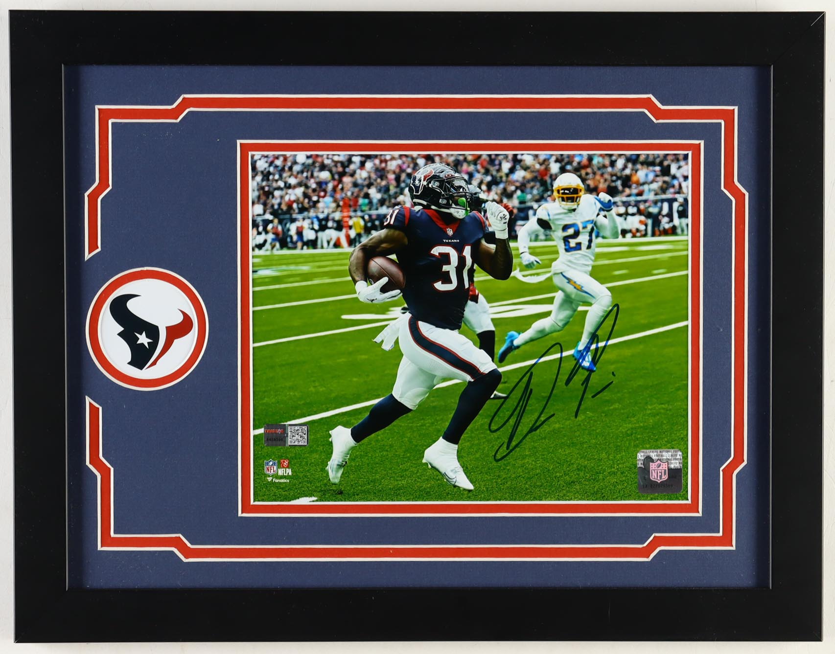 Custom frame measures 14" x 18" in size and features a photo that has been hand-signed by Dameon Pierce (Houston Texans).