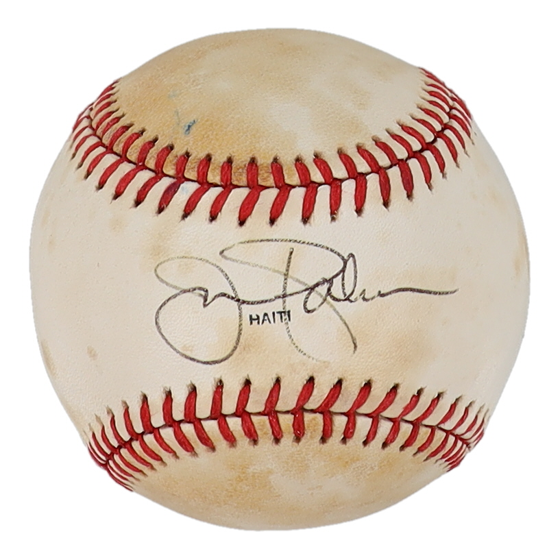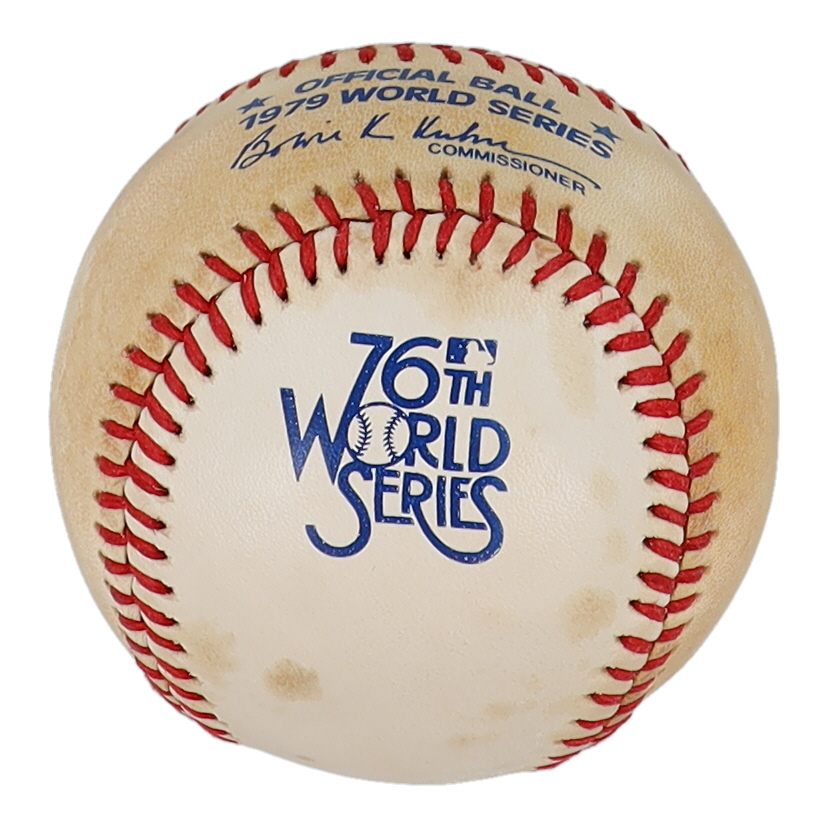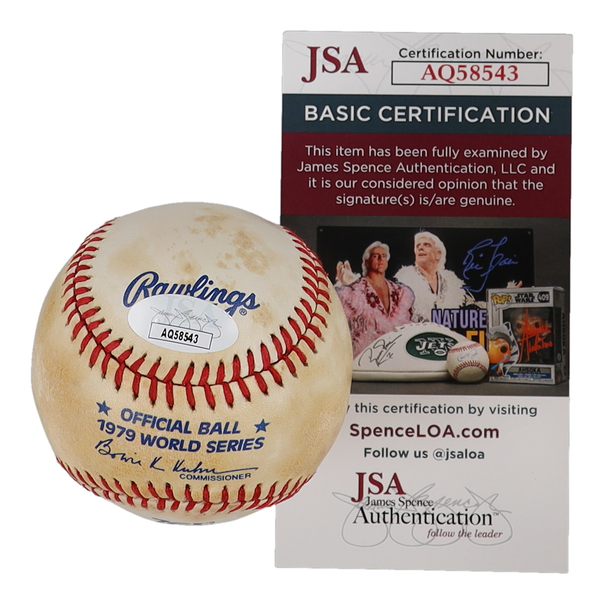 Rawlings Official 1979 World Series Logo Baseball. Hand-signed by Jim Palmer (Baltimore Orioles, HOF). Please note, the baseball is naturally toned and has staining.
