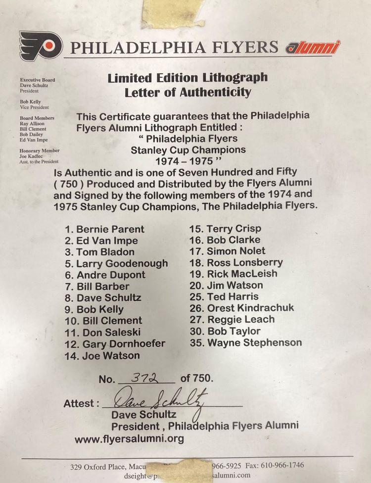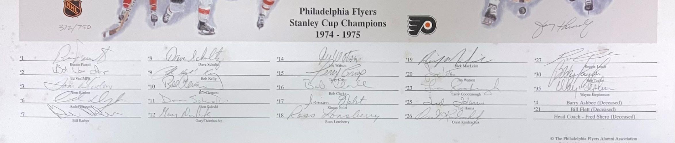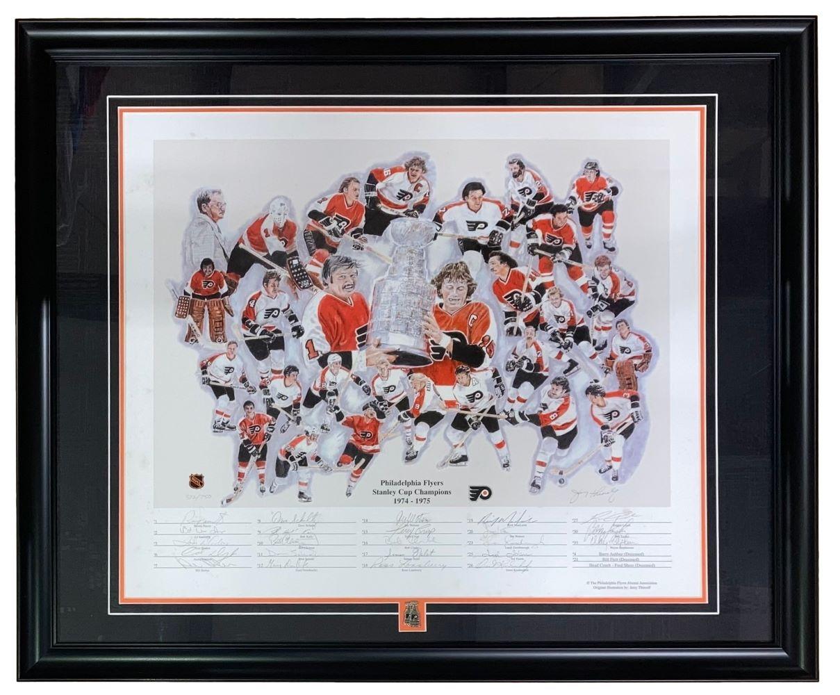 Custom frame measures 29” x 33” in size and features a limited edition lithograph that that has been hand-signed by (35) members of the 1974-75 Philadelphia Flyers. Signers include Bernie Parent, Ed Van Impe, Tom Bladon, Larry Goodenough, Andre Dupont, Bill Barber, Dave Schultz, Bob Kelly, Bill Clement, Don Saleski, Gary Dornhoefer, Joe Watson, Terry Crisp, Bob Clarke, Simon Nolet, Ross Lonsberry, Rick MacLeish, Jim Watson, Ted Harris, Orest Kindrachuk, Reggie Leach, Bob Taylor and Wayne Stephenson.
