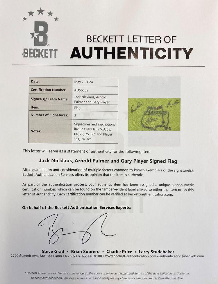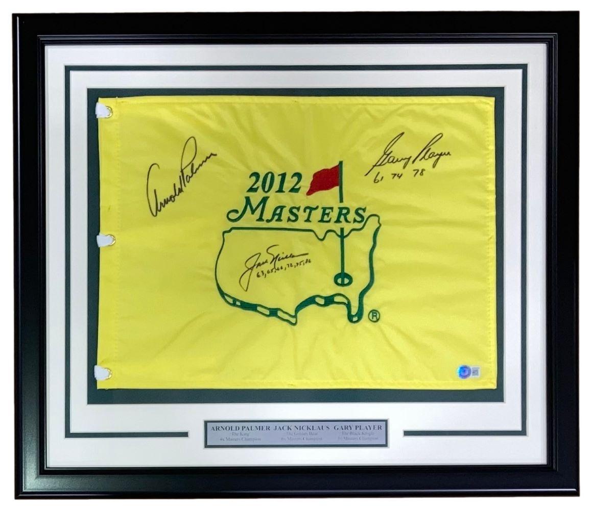 Arnold Palmer, Jack Nicklaus & Gary Player Signed 2012 Masters Custom Framed Golf Flag (Beckett)