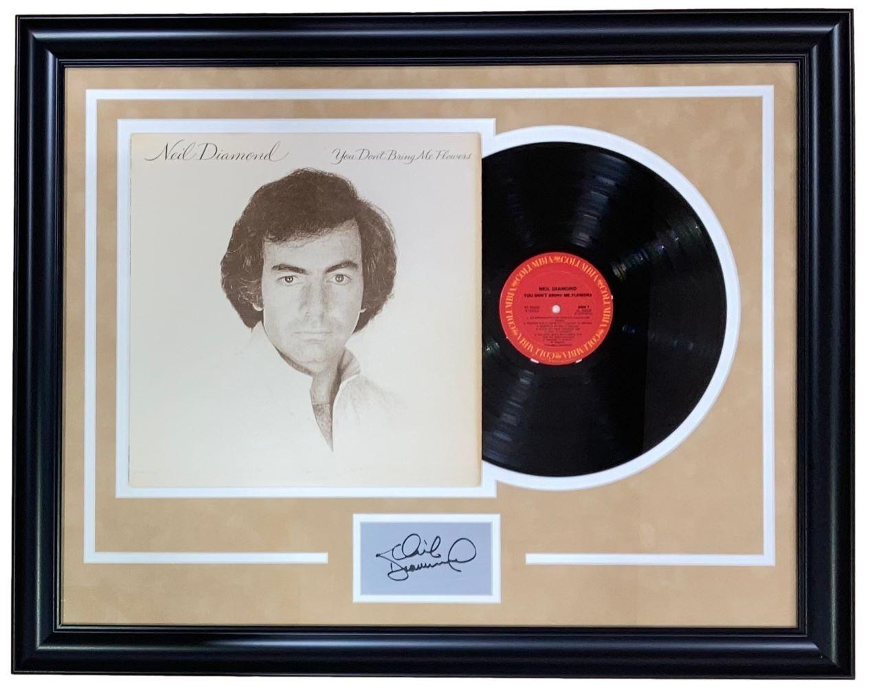 Custom frame measures 22” x 27” in size and features a "You Don't Bring Me Flowers" vinyl record album by Neil Diamond. Along with the framed record is a laser engraved facsimile signature.
