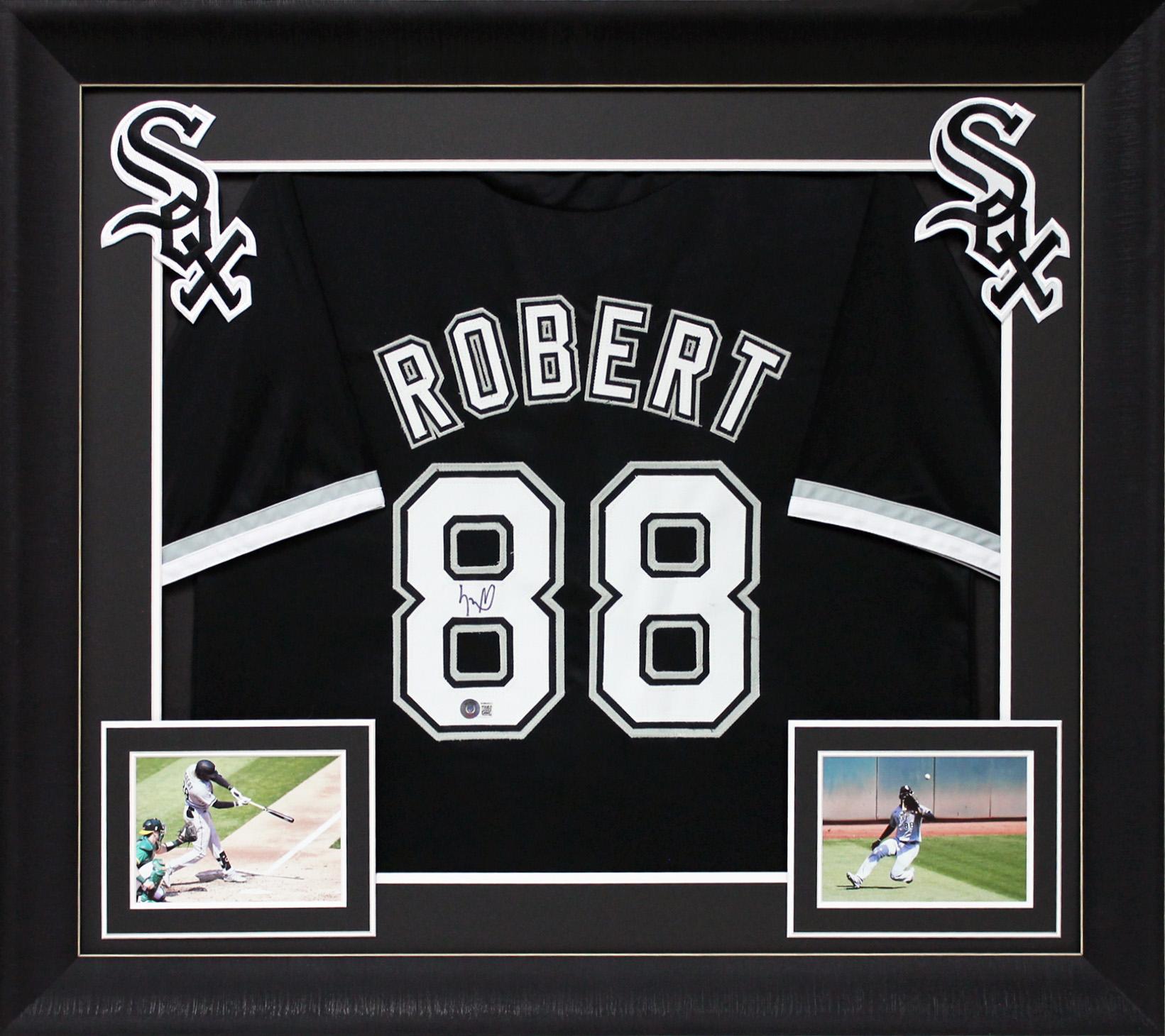 Custom frame measures 32" x 37" in size and features a jersey that has been hand-signed by Luis Robert.