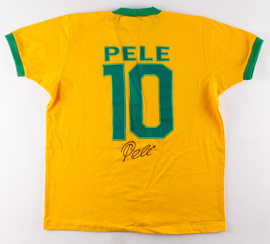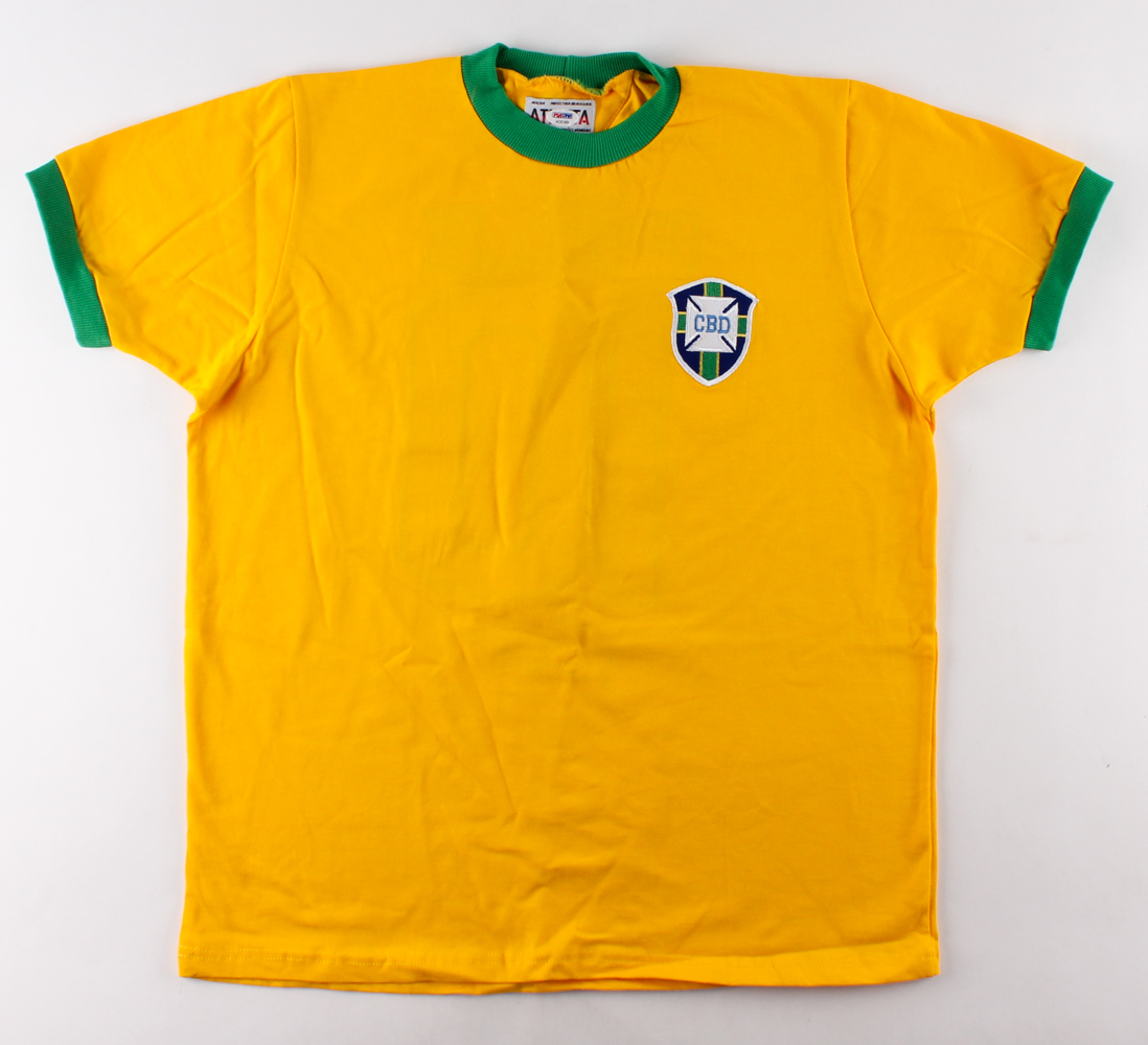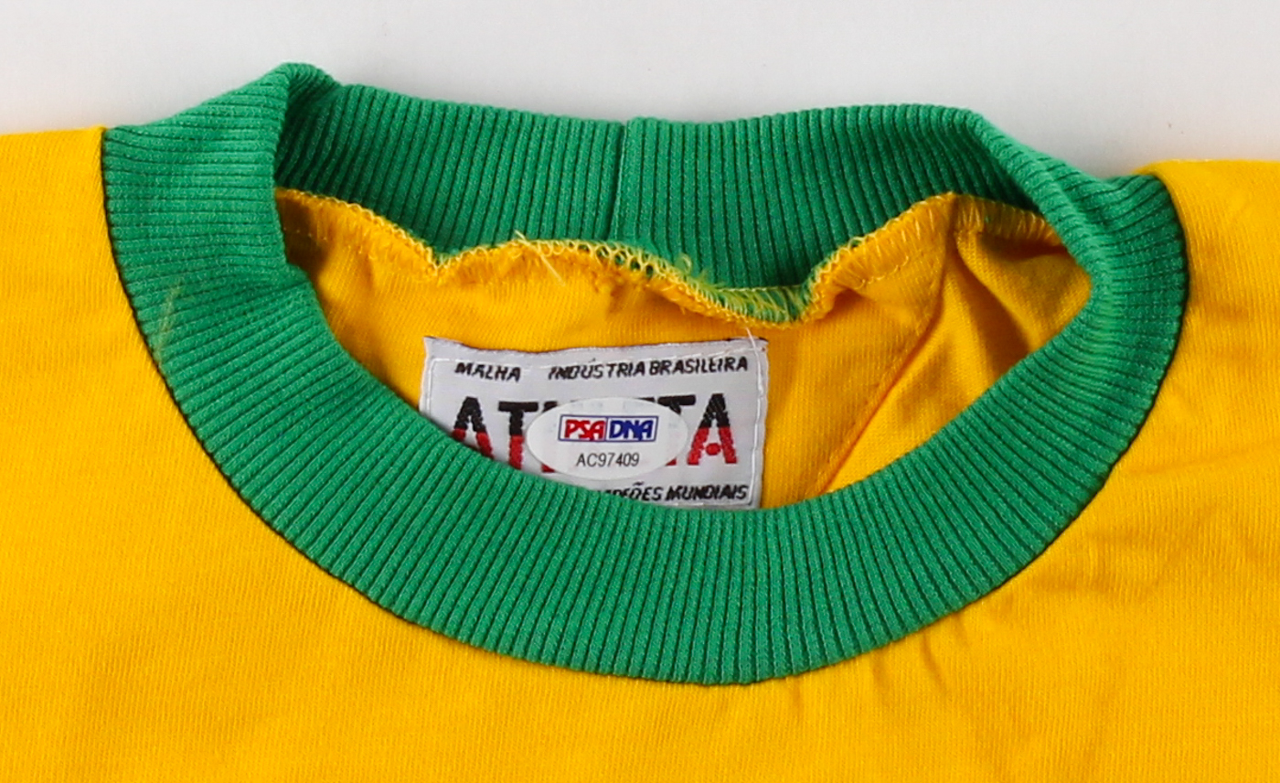 Team Brazil authentic Pele 1970 World Cup Finals jersey manufactured by Athleta. Athleta is the original company that produced the jerseys for Team Brazil. Everything is sewn on. Hand-signed in black felt-tip pen by Pele.